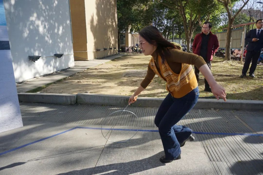 滚铁环折返接力赛中,老师们激情饱满,卯足了劲,奋力滚动铁环,紧贴地面线路完成折返。这既是个人智慧和体力素质的角逐,也是团结和协作的比拼。速度与激情交织,每一位参赛老师都在努力拼搏,每一个铁环的滚动都承载着老师们对团队的热爱和奋斗,呈现出了一场富有活力的比赛。