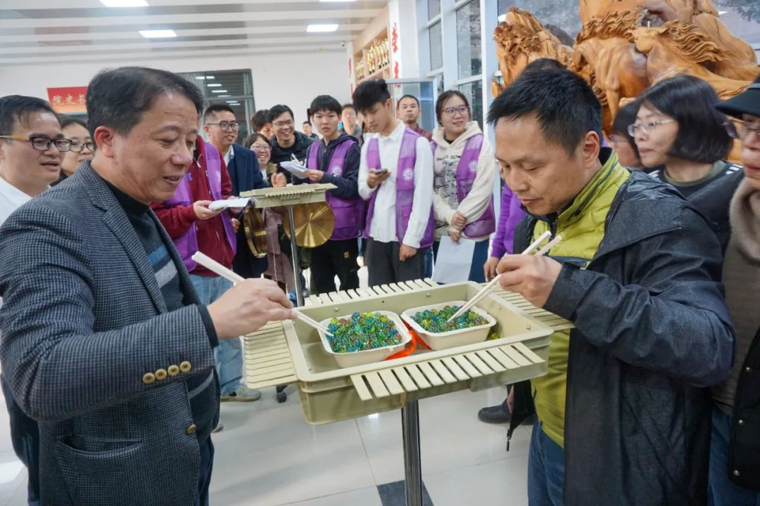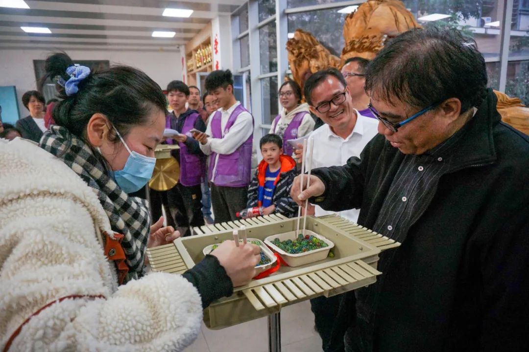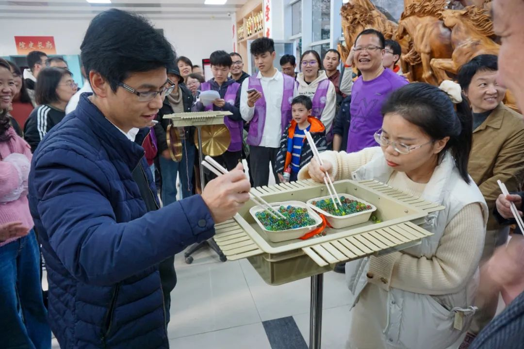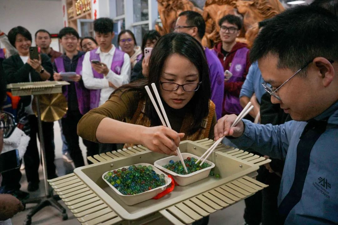 在“筷子夹弹珠”项目中,老师们展开了一场速度与灵活度的比拼。一群人,一条心,一起拼。通过巧妙的技巧和灵活的手腕,老师们竞相夹取弹珠。每一次成功的夹取都引发阵阵欢呼声,展现了老师们的技巧与巧思。