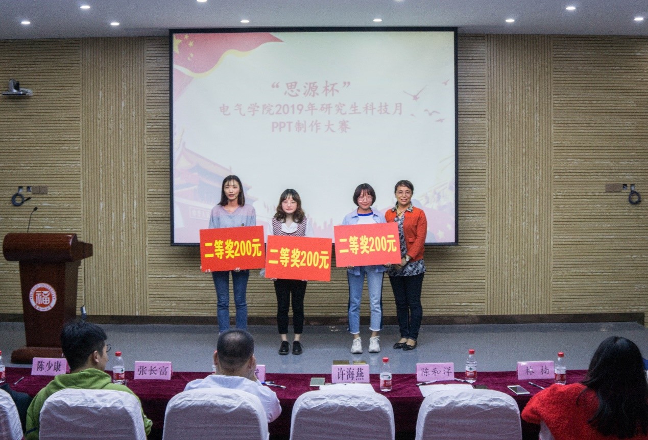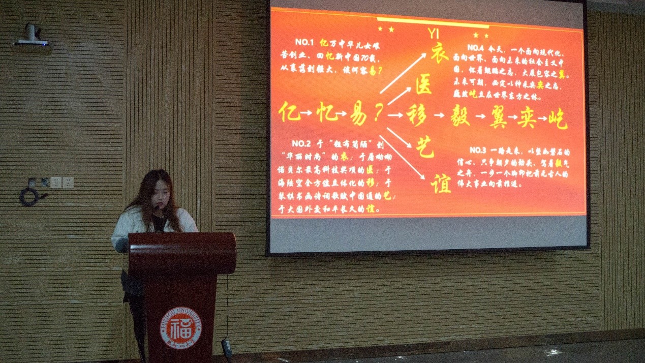 大赛在主持人简短的介绍后拉开了帷幕。本次比赛共有11支参赛队伍,各支队伍精神饱满、充满激情地围绕着新中国成立70年来的成就进行了多方面的讲演。如“zhang家屯”队以“yi”音贯穿全篇,以小见大,表现形式新颖独特,衔接连贯,逻辑性强,展现出中华民族屹立于东方之林的原因;“根正苗红”队在背景音乐上驾驭的比较有特色,“祖国的花朵”队在PPT制作时排版恰到好处,图文处理恰当合理,主题上结合自身专业实际的特点,展示了新中国70年来“电”的发展,演绎形式给人眼前一亮的感觉;再如“红领巾”队在制作时将福大的建校发展历程与新中国的教育发展相结合,内容贴切实际,图文并茂,文字言简意赅,PPT制作时基调为喜庆,展示出一种浓浓的中国风味道。