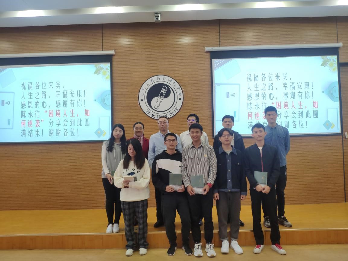 首先,陈永往学长向在场的各位研究生讲述了他个人充满坎坷,努力拼搏、最终逆袭的曲折历程。他的前半生遭遇到了巨大的变故和磨难,但他永不放弃自己,从不向命运低头,最终战胜了命运,成为了命运的主宰者,并逆袭成为一名优秀的文理兼修者,母校“明德至诚,博学远志”的践行者。他在困境中逆袭的经历和不屈不挠的顽强精神引来了现场听众的热烈掌声。陈永往学长还和大家分享了他创作文学作品的心路历程,他表示作品是以亲情、爱情、友情为主题来记录自己的人生成长和感悟。诚如他所说的“我们寻寻觅觅所谓完美的人生,世间往往很少有。其实不太完美的的人生,才是大部分人真实的人生”,这正是他对于困境中如何成功逆袭的最真实的人生感悟,也给在座各位的青年如何积极乐观地对待人生做出了正确的引导示范。在接下来的互动问答环节,在场的研究生们寸莛撞钟的向陈永往学长交流了有关人生与文学作品内容的细节问题,陈永往学长也热情给他们一一解答,现场气氛十分活跃。诚如书中序言有提及他在1998年所遭遇的那场横祸,那风华正茂的年纪,准备大显身手的时刻,却遭到命运的无情轰击。在这种突如其来的人生意外面前,有人选择自暴自弃,有人选择逆境自强,但如同美国著名牧师诺曼‧文森‧皮尔(Norman Vincent Peale)所言:「改变你的想法,便会改变你的人生」(Change your thoughts and you change your world.),陈永往学长选择逆境自强,并由此收获爱情,重获新生。人生可不可能否极泰来,有时就在一念之间。
