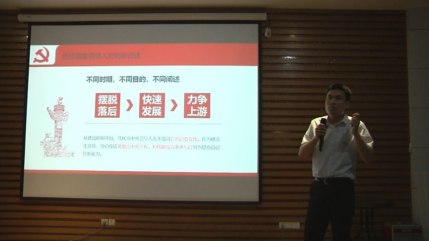 最后一位出场的是电气工程研究生第一党支部书记李继宇,他的微党课题目是《创新引领发展》。李继宇同志以中美贸易摩擦为例指出科技实力的较量本质是创新实力的比拼,而作为研究生党员的我们应该加强学习、排除偏见思维努力锻炼自己的创新能力,才能让资本主义对我们的封锁瓦解。