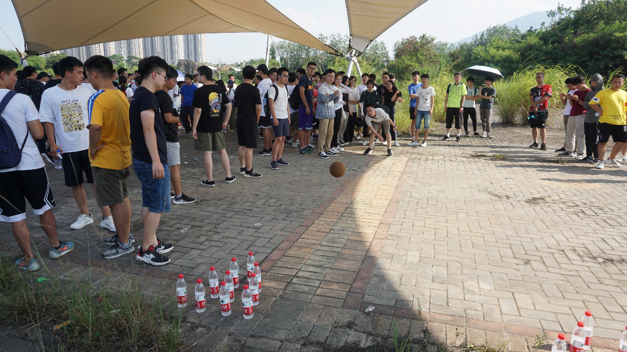 在距参赛者 10 米处堆置 10 个矿泉水瓶(一个三角形),参赛者用篮球击打目标。小组 8 名队员所击打矿泉水瓶之和,即为该小组的最终比赛成绩。