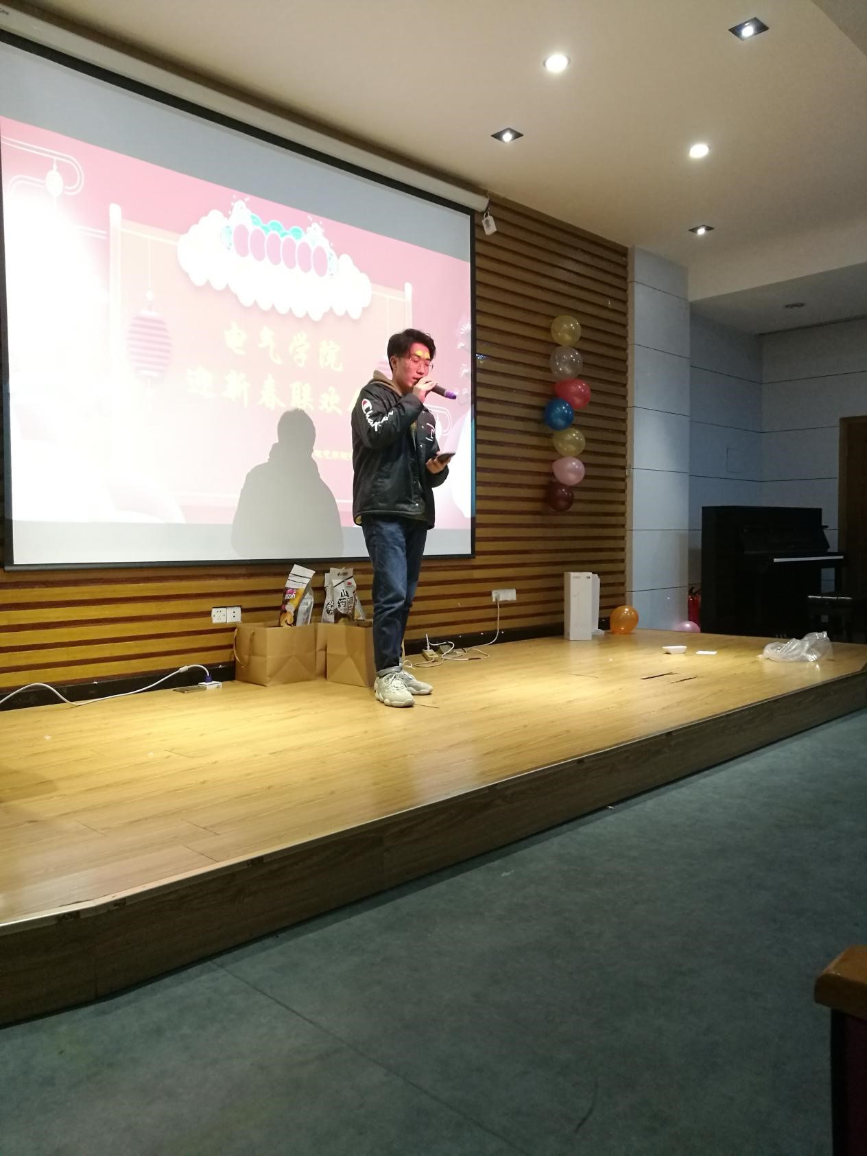 晚会主体由游戏环节、才艺表演环节以及抽奖环节三部分组成,各环节穿插进行,使得整个活动丰富多彩。“听歌识曲”、“心有灵犀”等游戏极大地调动了全场人员的热情。在才艺表演环节,何承烨同学的一段Beatbox彻底点燃了全场观众,娴熟的口技给人印象深刻,一改我们电气学子只会搞科研的理工男形象。“穿越呼啦圈”游戏,一些同学滑稽的动作令观众捧腹大笑。接下来是“十佳歌手”孙毓璞的showtime时间,一首张学友的《慢慢》将电气学子的音乐细胞展现的淋漓尽致。“爆气球”是一个激情似火的游戏,非常考验团队协作能力,也将晚会氛围带向高潮。最后工作人员将小奖品铺满地板,请大家上台扔圈套奖品,套中即可带走,看其简单,实则还真是个技术活。