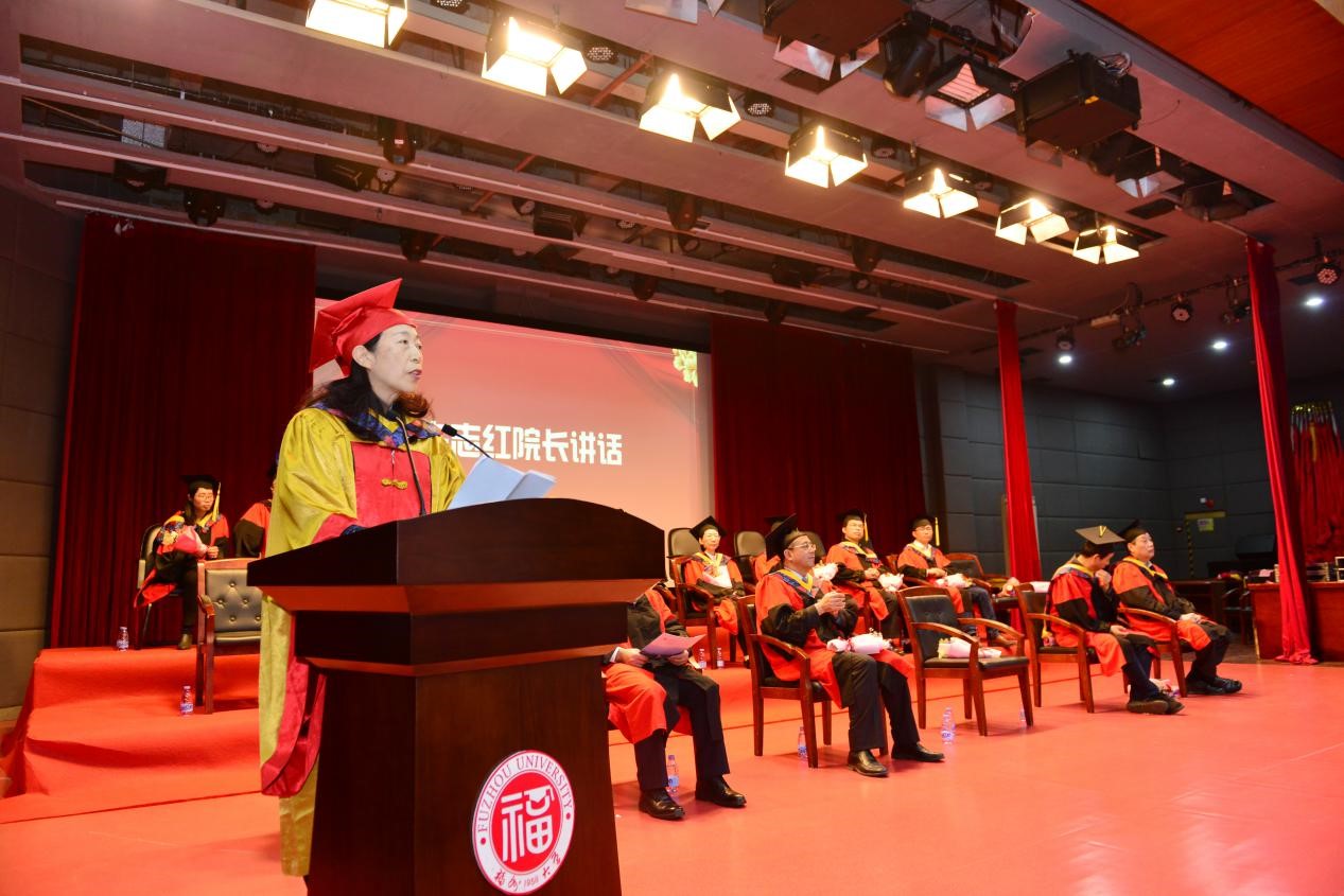 典礼伊始,在优美的交响乐《沃尔塔瓦河》的乐声中,同学们庄严并立在红地毯两侧,手捧鲜花欢迎导师们入场,并向恩师们献上自己精心挑选的鲜花。伴随着鼓舞人心的国歌声,毕业典礼暨学位授予仪式正式拉开帷幕。首先是副校长杨黄浩教授致辞,杨校长期望我们能够永葆自己的先进性,发扬“福大明德至诚,博学远志”的校训,实现“达则兼济天下”的理想,为社会和国家贡献自己的才能。第二项议程是薛禹胜院士寄语,薛老语重心长地讲述自己年轻求学的种种经历,教诲我们年轻一代要珍惜现有的大好条件,刻苦努力,不忘初心。随后,薛老亲自为毕业生汤云东博士执拨穗礼,杨校长为其颁发了博士学位证书。伴随着鲜花,学生代表在台上朗诵了一首《三月春风》,为毕业生送上了最美好的祝福。