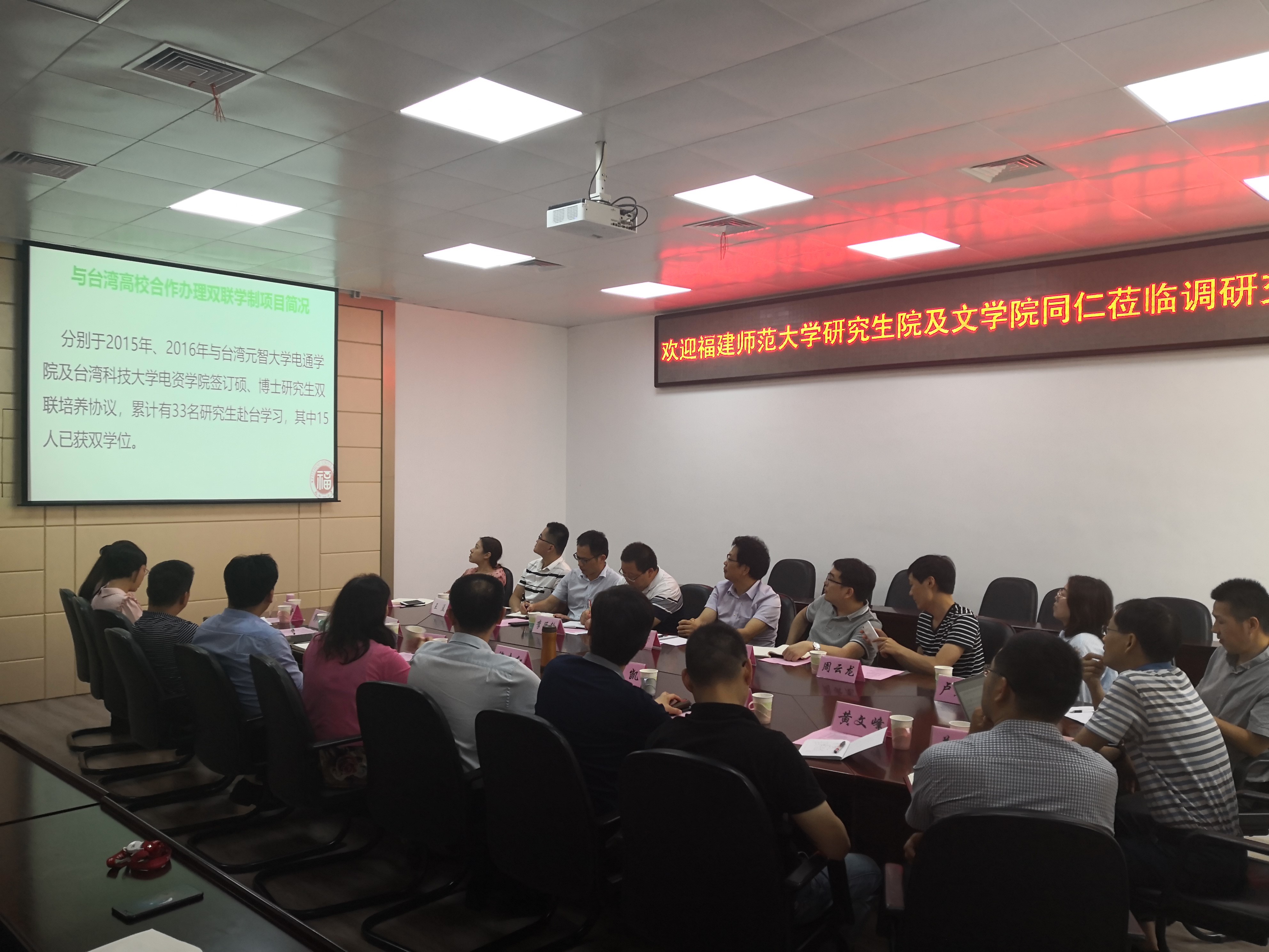 与台湾元智大学及台湾科技大学的联合培养情况进行分享。福建师范大学研究生工作部副部长汪启思介绍了福建师范大学本科生境外交流的情况。我校对外合作与交流处中外合作办学科陈晴老师也详细介绍了中外合作办学项目申报的流程、所需材料和准备工作。接着,双方主要针对以下问题展开讨论和交流:中外合作办学研究生招生情况、中外合作办学研究生培养情况、中外合作办学研究生事务管理情况、中外合作办学研究生奖助情况、中外合作办学项目申报有关事项。