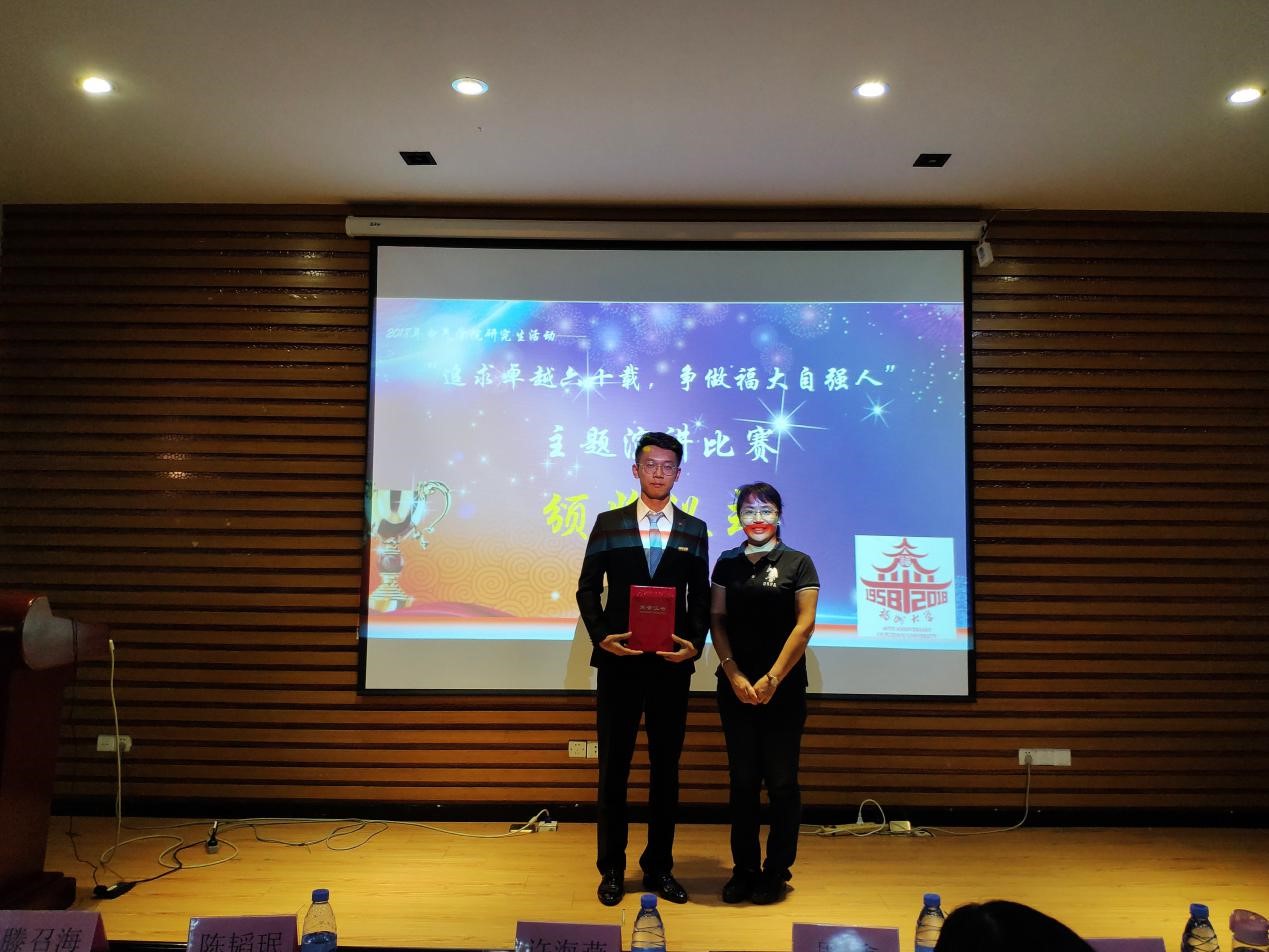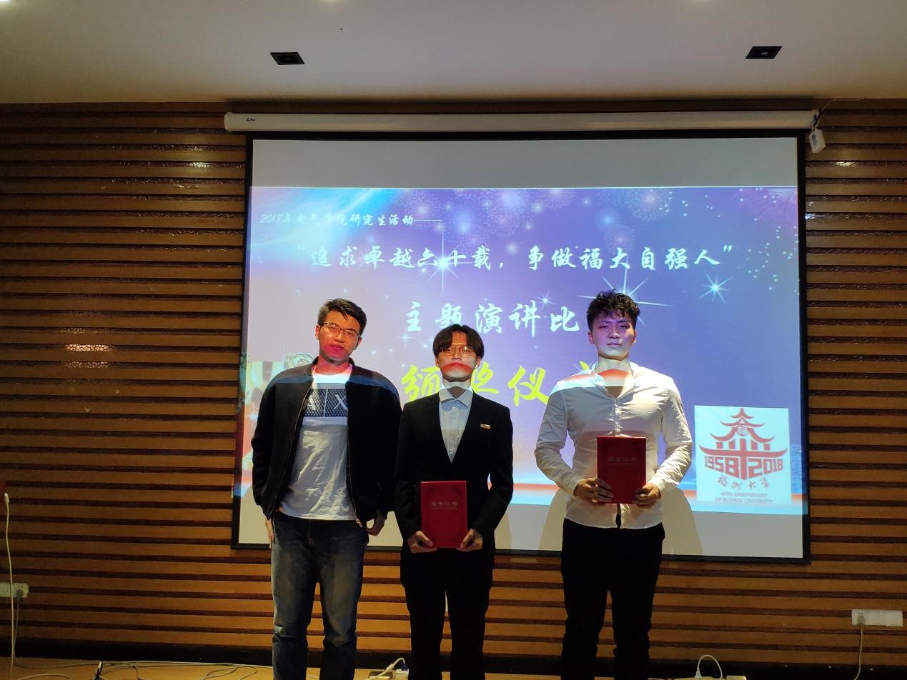 也不甘落后,积极举办了“追求卓越六十载,争做福大自强人”主题演讲比赛为母校生日献礼。本次活动的评委嘉宾有研究生辅导员许海燕老师,以及省演讲比赛二等奖获得者李琼琼、校演讲比赛中表现优异的16级研究生陈韬珉、自动化研究生党支部书记周鑫和院研会副主席滕召海。