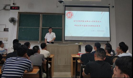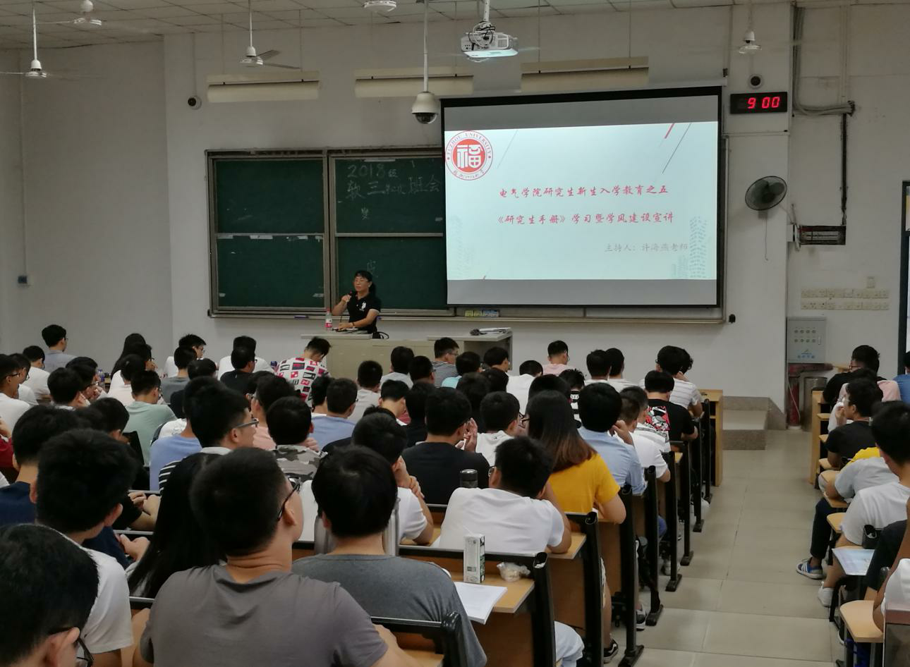 2018级新生开学典礼在图书馆博学厅召开,参加典礼的有学院领导以及2018级全体本科生和研究生,典礼由院党委副书记黄国辉老师主持。上午十点半,由教学秘书郑丽华老师带着全体研究生新生学习《研究生手册》,旨在让大家充分熟悉教育管理、学籍与培养管理以及毕业与学位管理等相关规定。下午两点半,由邵振国副院长为大家进行学院情况介绍、校情校史教育、学术道德教育、创新创业教育;会后安排了学位点负责人与研究生新生见面会,讨论遴选导师及专业培养相关事宜;接下来安排了上学期科技竞赛获奖团队队长阴存翊、何幸、庄胜斌与大家进行深入交流并介绍其成功经验;最后是研究生会主席柯斯凯同学带领各部门干部为大家介绍研会学生工作,并真诚地为新生同学答疑解惑。