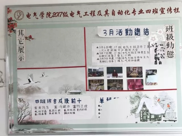 优秀的学风,少不了班风的配合。在班级宣传板上展示自己班级近来的活动状态,同时,班级宣传板分享班级学习近况,方便班级同学了解自身差距,明确学习目标,争做上流。这里不仅有“不思,故有惑;不求,故无得;不问,故无知”关于探求知识的班训,也有“良心无愧,信心无畏,青春无悔”对于品质要求的班规。