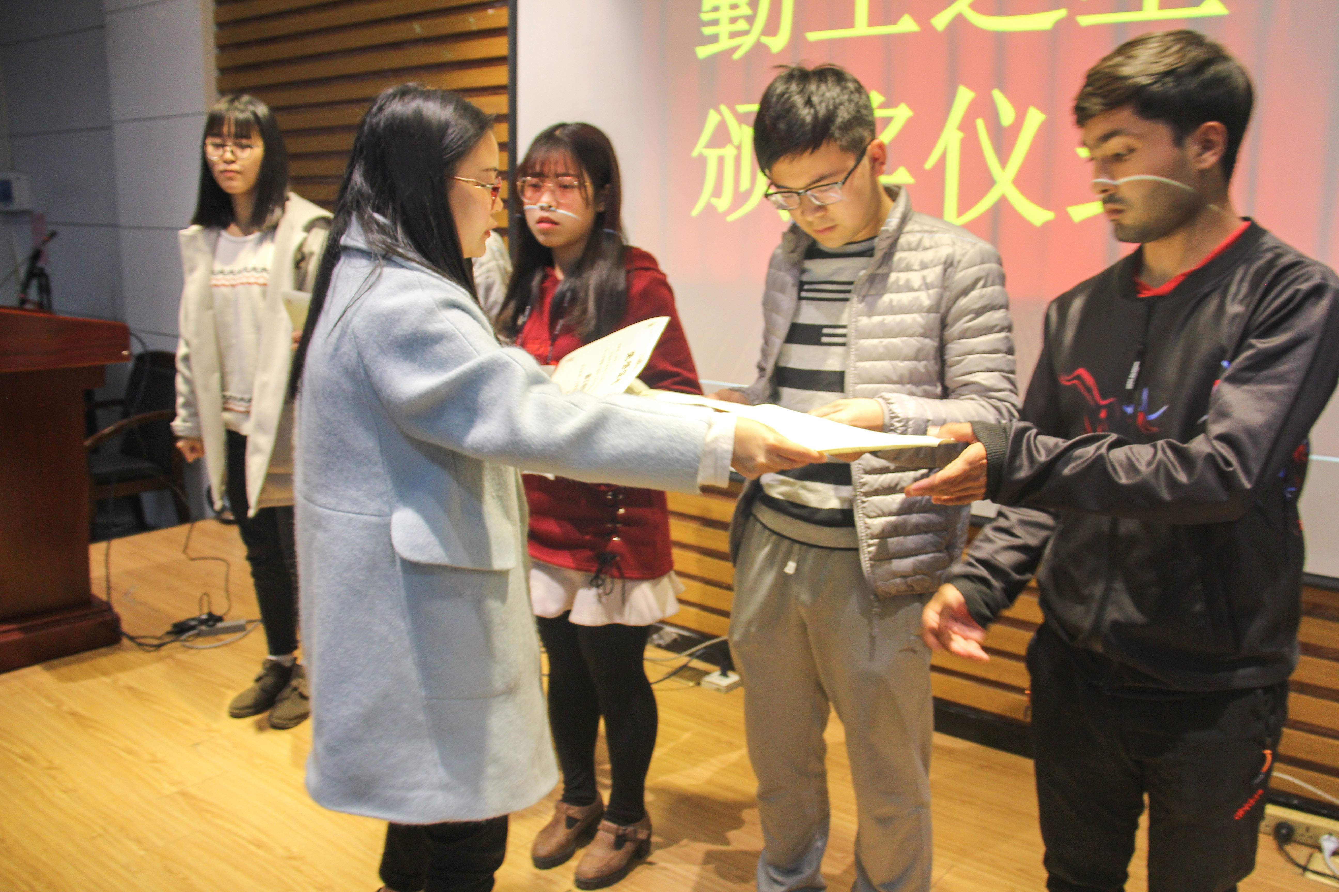 紧接着,会议第二项议程是“勤工俭学优秀人员颁奖仪式”,梁艳华老师给六位勤工之星颁发奖状,并合影留念。