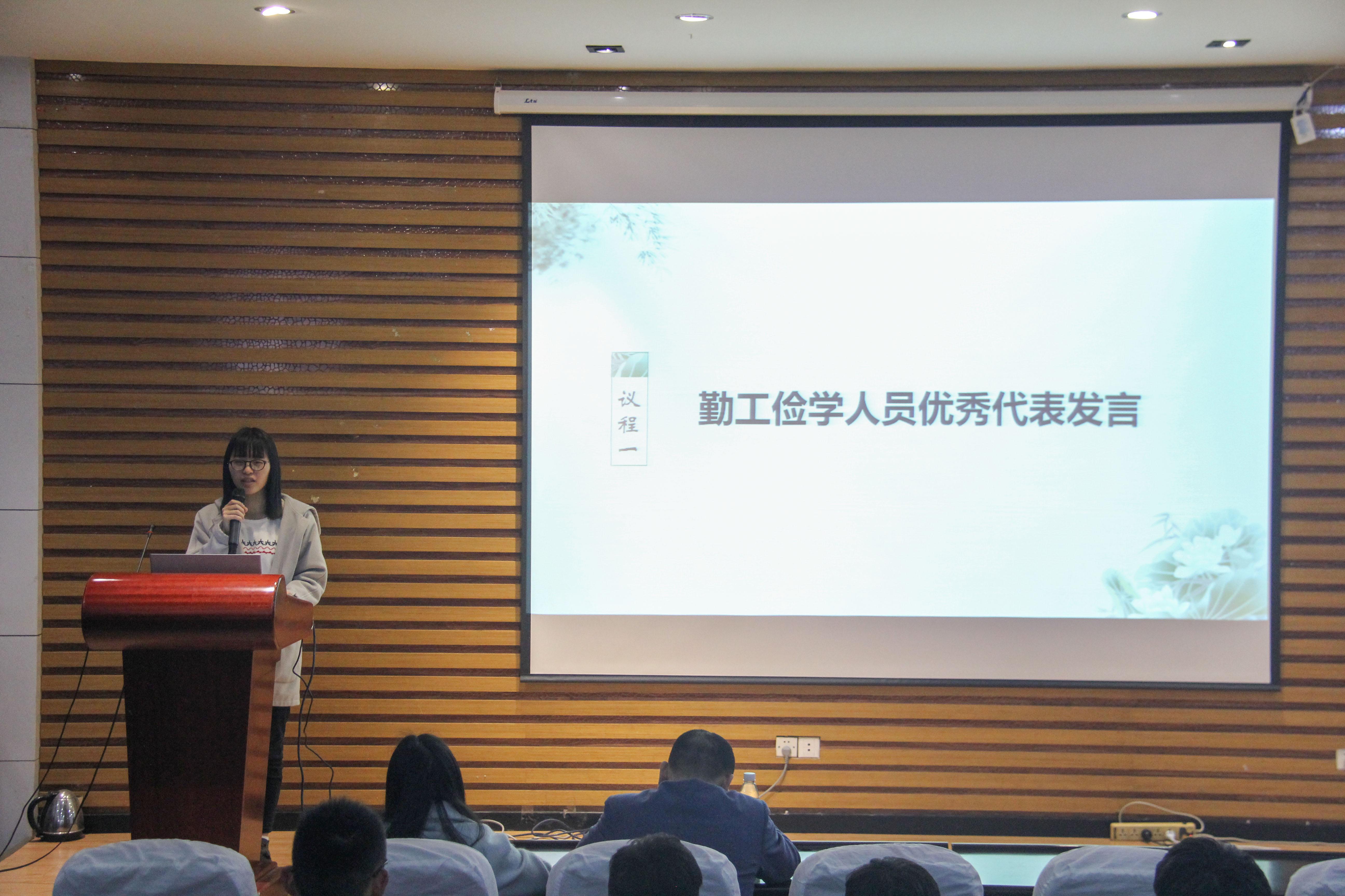 会议第一项议程是“勤工俭学人员优秀代表发言”,15级勤工俭学优秀代表包淑真与陈玉如发言。他们向同学们分享了自己勤工俭学的经历体会,并鼓励与他们来自同等普通家庭的勤工俭学人员笑对生活,坚强勇敢地追逐自己的梦想。