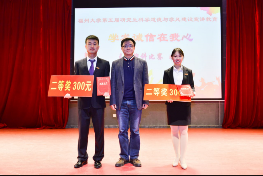 比赛开始后,在场的选手分别对学术诚信进行了引人入胜讲演,他们激昂高亢,深情饱满,自信满满地站在台上完成了各具风格的演讲,富有感染力的神态动作和声情并茂的语言表达一次次打动了在场的评委和观众,赢得场下阵阵掌声。在评审方面,比赛由评委当场进行统计并按出场顺序分四次,三人一组公示分数。参赛选手演讲结束后,评委老师对各个选手进行专业的点评,并由主持人公布了最终的获奖名单,选手依次上台领奖。全场观众对获奖的同学都报以热烈的掌声。比赛结束后,获奖的同学上台与辅导老师、评委以及学院代表进行合影留念。