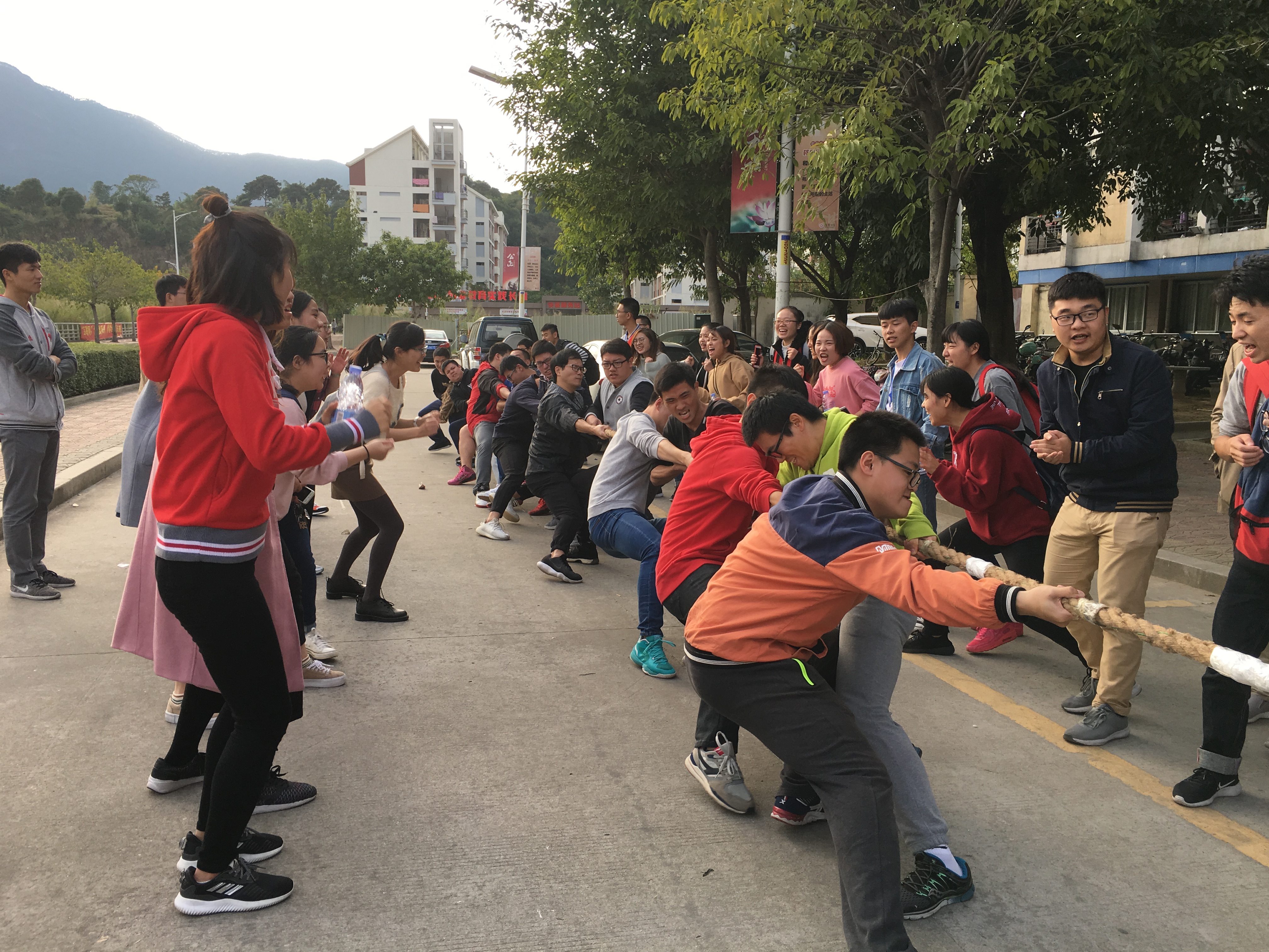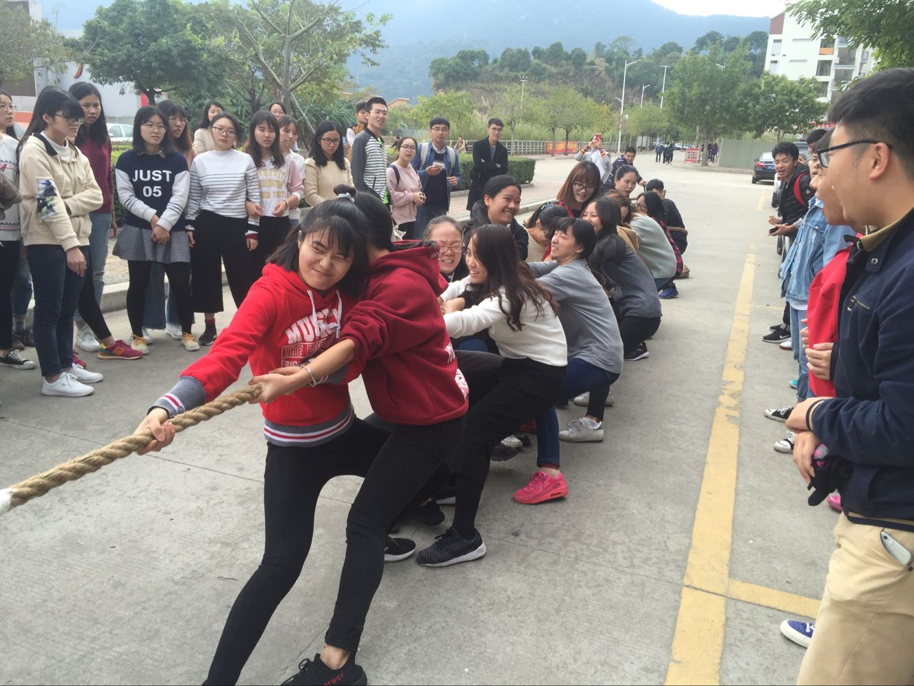 参赛队伍以年级为组别,本科生每个年级与研究生各派出男,女队代表队,每个队15人,共有10支队伍。比赛实行淘汰制晋级方式,抽签分组决定比赛顺序,常规赛采用三局两胜制,另设复活赛,第一轮失利的队伍进入复活赛,获胜的队伍继续进行比赛,复活赛采用单局淘汰制。当比赛的哨声响起,队员们双手紧握长绳,憋足了劲拼命往后拉,他们个个面红耳赤,使出浑身解数,口中一齐高呼着“一二,一二”,向着胜利进发。各队的拉拉队成员也在旁助阵加油,鼓声、呐喊声,此起彼伏,飘荡在上空。经过激烈的角逐,最终在同学们的努力之下研究生男队女队都斩获了亚军的优异成绩。