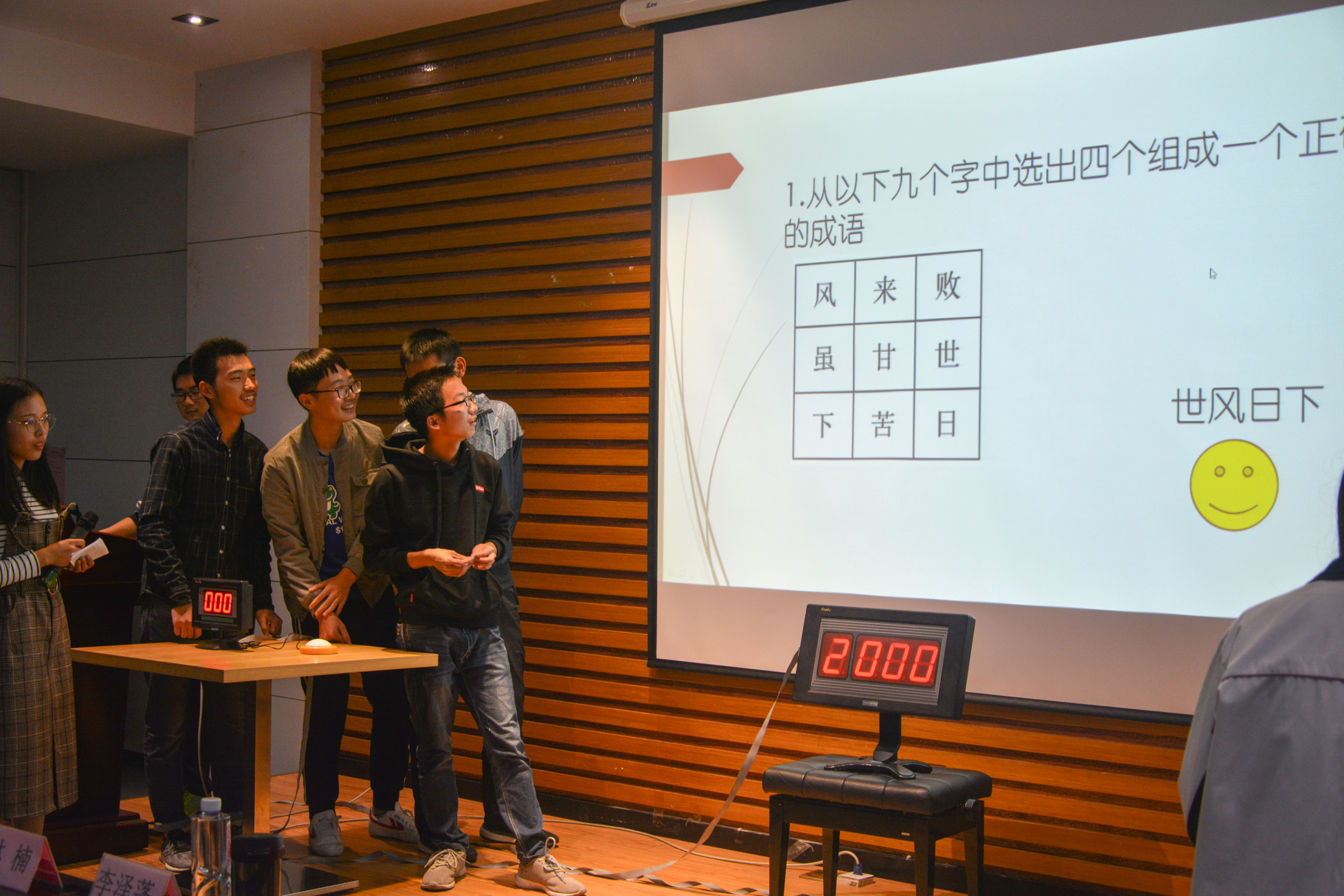 “用思维作笔,以语言为墨。”成语大赛决赛就在此般激奋人心的语句中拉开了帷幕。在第一轮“坚持到底”的比赛中各支参赛队伍都认真思索,或低声交流,全场弥漫着紧张却令人激动的气氛。答对者为顺利通过一关而兴奋并相互加油,答错了则为失败而感到懊恼、遗憾,无论答得如何他们都全心投入到比赛之中。失败了依旧为对手的机智和渊博的学识感到惊叹并为之鼓掌,成功了也不骄不躁并相互加油。最终原生态队、银河战舰队、无言以队、倔强卿梧队、为所欲为队、不得超过七个字队、千仞队和神奇宝贝队从十五支队伍中脱颖而出晋级后续比赛。