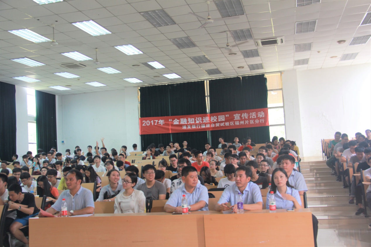 2014级在东3-100召开了年级大会并开展了“金融知识进校园”的主题活动。会议由2014级辅导员尹万东老师主持。浦发银行福建自贸试验区福州片区分行汤方满行长一行7人及兼职辅导员徐心靖老师参加了活动并给学生做了很好的金融知识讲解。
