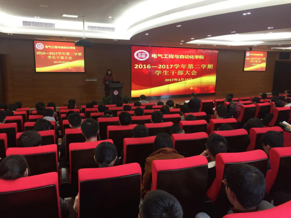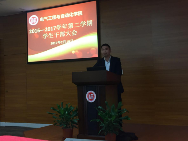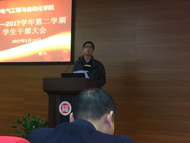 最后,黄国辉老师对学院2016年各项工作进行了总结、对学生干部提出了希望。他全面总结了去年学院学生工作:学院顺利拿下了“电力人才网络联盟”校园招聘基地这块牌子、成功承办了“第十一届全国电力人才就业论坛暨2017年毕业生供需信息交流会”,其他各项工作也稳中有进,这些成绩的取得都得力于学生干部的积极支持、努力工作。他希望学生干部在新的一年更要严于律己,树立为同学服务的宗旨,在学习与生活上管好自己的同时还要热心帮助同学,学会沟通、学会做人,真正起到先锋带头作用,在具有电气特色的创新创业赛事中更要积极参与、学以致用,力争取得好成绩。