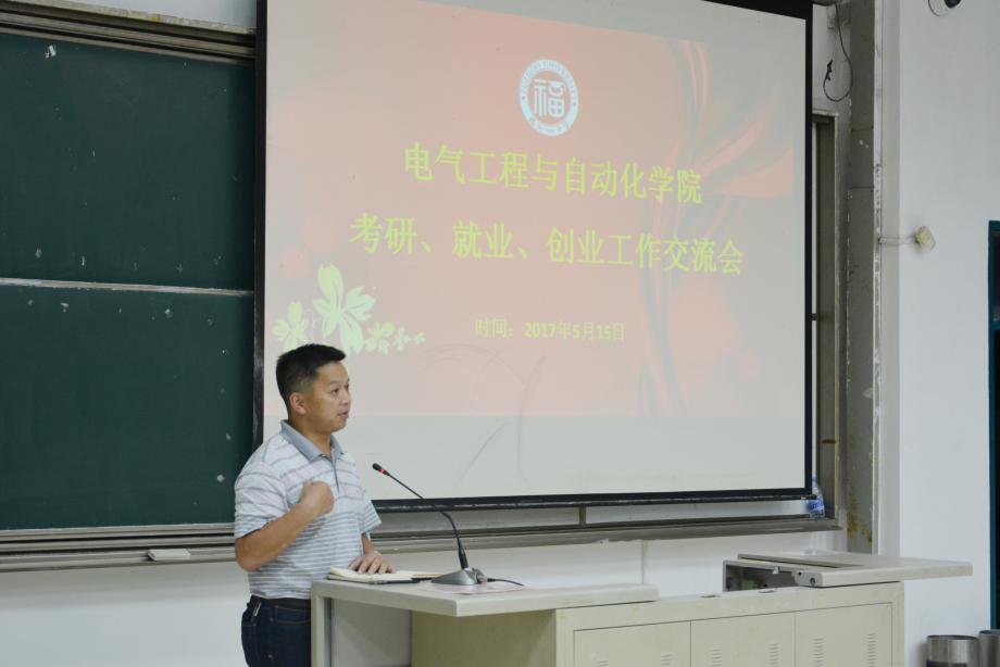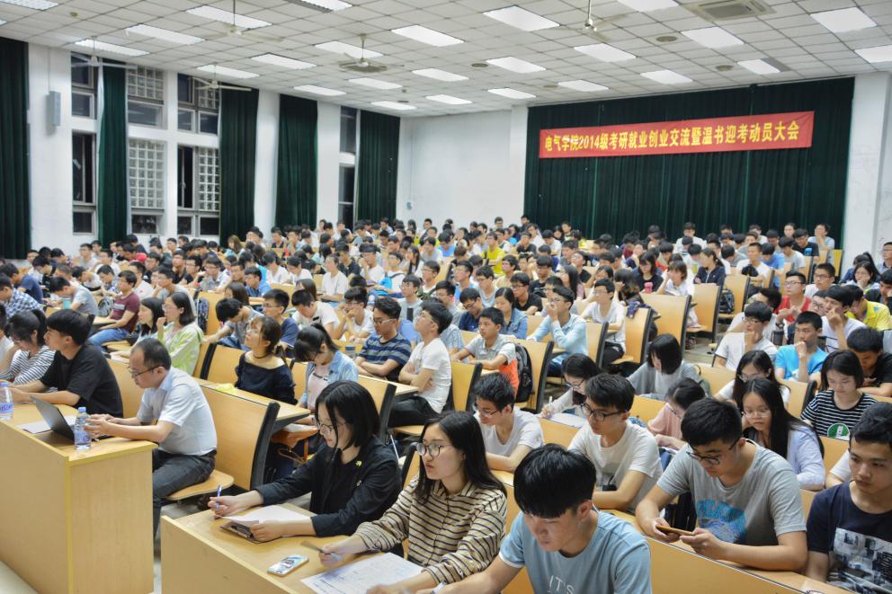 大会首先由2013级的优秀学生代表分享了他们的经验。保研到武汉大学的孔顺飞同学分享了保研的三段式流程以及如何突出自己优势的技巧;以总分416分的高分考取华中科技大学研究生的陈进按同学从选择学校、备考资料选取、时间安排、复习方法等方面给出了建议;就业于福州市水务投资发展有限公司的徐春玲同学从就业方向、简历制作、面试技巧以及用人单位对女生找工作的顾虑等方面进行介绍,建议在场的同学们利用暑假时间去实习;就业于龙岩电业局的陈伟峰同学从面试技巧谈起,随后介绍了国网公司的报考流程、复习过程、复习材料准备等注意事项;2010级保研到电气学院、现担任中海创集团董事长助理的郑伟彬学长给大家分享了他的大学生活以及创业经历,围绕“做一个属于自己的选择”、“拥有一颗坚持不懈的心”做了精彩的发言。2014级考研学生代表朱怡晨同学、就业学生代表廖晨帆同学也分别针对考研和就业发表了她们的看法,她们都指出不应该随波逐流,要认清自己,选择适合自己的方向。