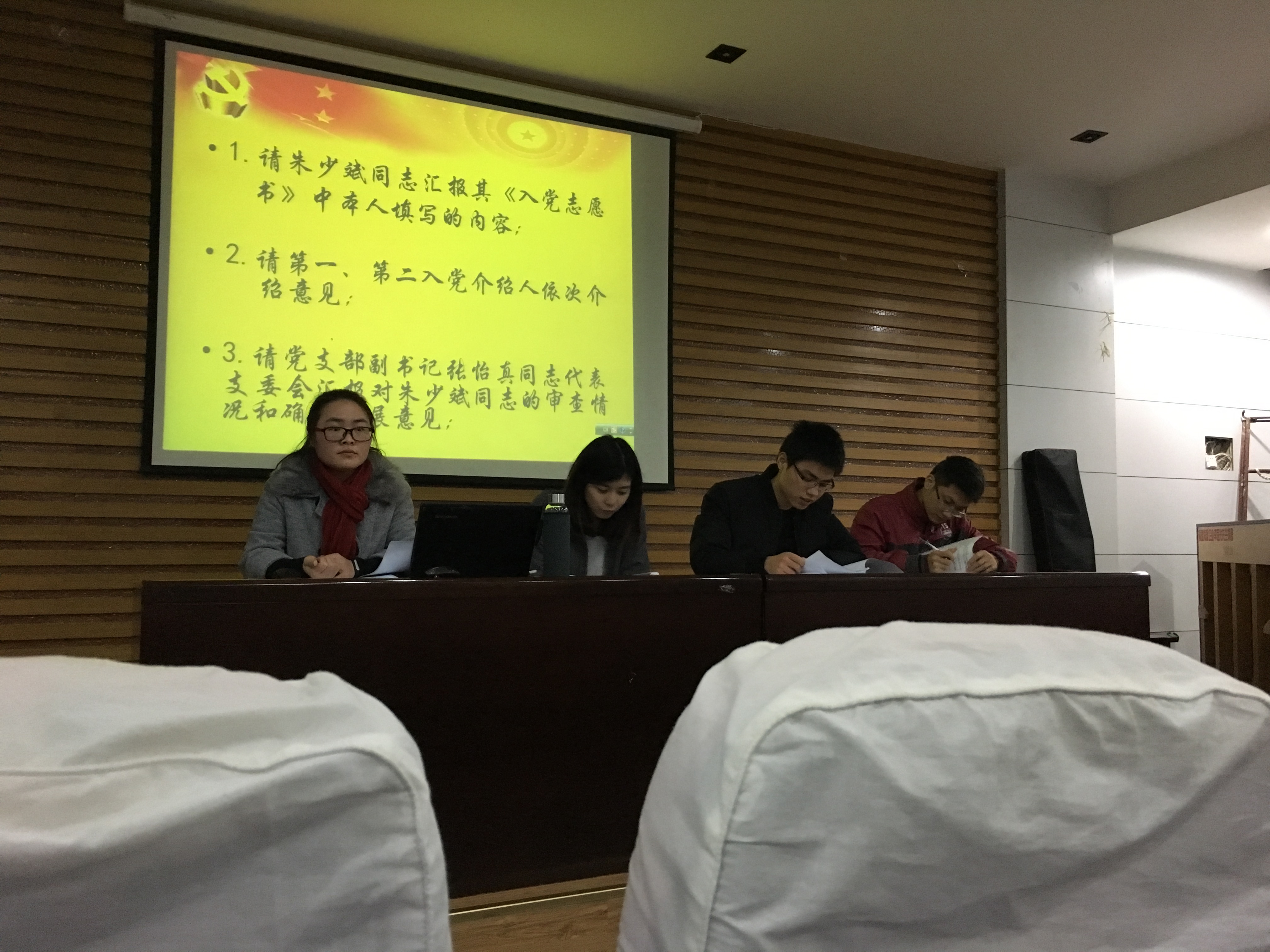 首先,支部副书记张怡真同志按照党的章程主持讨论朱少斌同志入党问题的讨论。朱少斌同志介绍了自身情况,宣读了《入党志愿书》并庄严的给出了自己的入党承诺。随后,入党介绍人及与会党员就朱少斌同志所存在的优点与不足展开了充分讨论,该同志也就其他同志提出的建议及问题做出诚恳的表态。经过无记名投票,与会22名正式党员全票赞成通过接纳朱少斌同志为中共预备党员。而后,支部书记刘秋花同志组织支部党员进行党风党纪学习。刘秋花同志首先介绍了党章中有关党风党纪相关规定,接着组织大家观看《永远在路上》纪录片。与会同志在观影后展开讨论,认为以习近平同志为核心的党中央把全面从严治党提升到“四个全面”战略布局高度,对我赢得党心当民,反腐惩恶,整治腐败问题有重要指导意义。