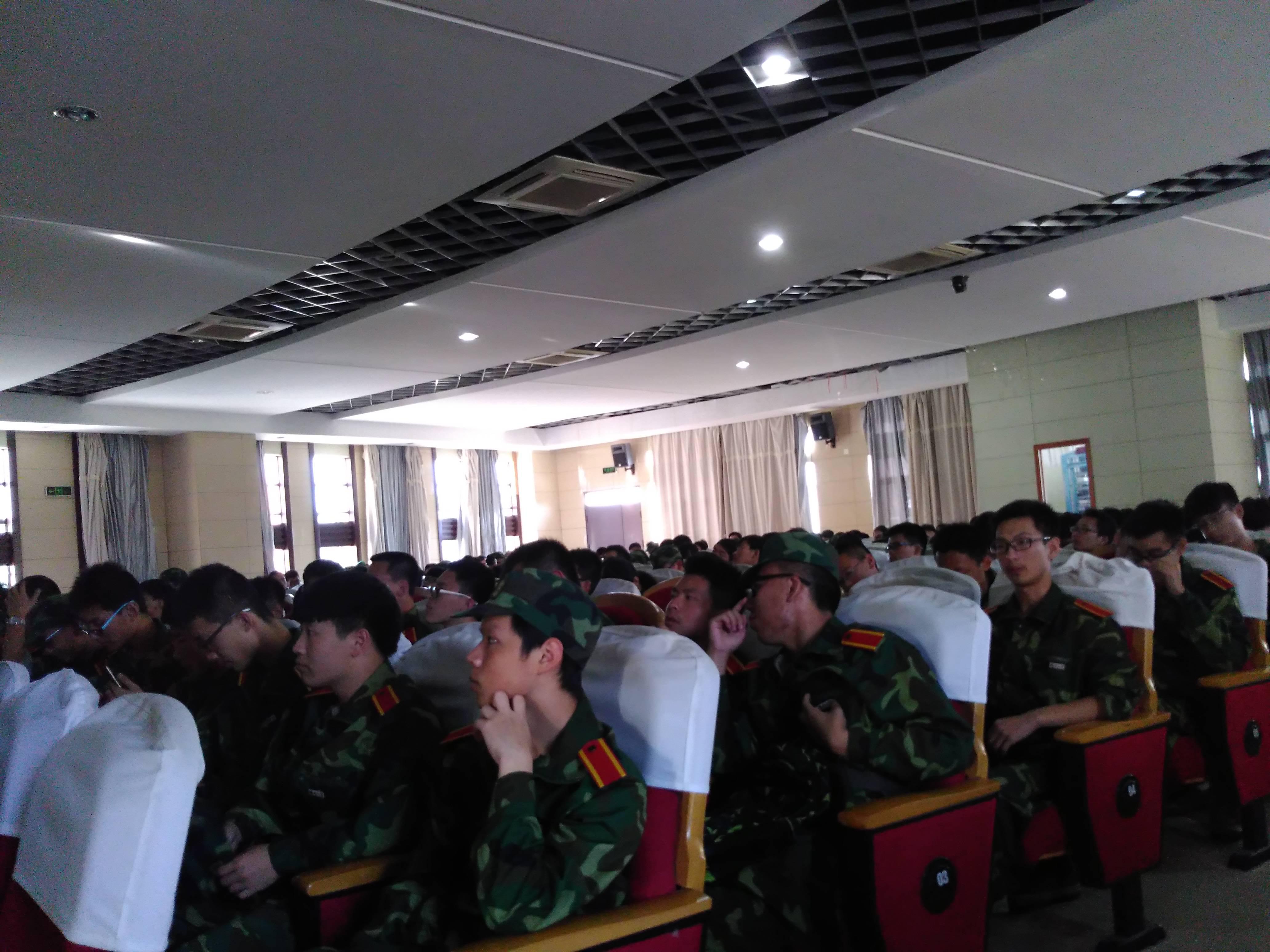 2015级新生军训动员大会在素拓科学报告厅顺利召开。本次大会由院团委副书记沈庆斌老师主持,院党委副书记黄国辉老师,2015级新生辅导员段小华老师,2015级新生兼职辅导员陈杰,部队军训团二营营长兼一连连长王韬教官、二连连长,各排排长等部队教官出席大会。