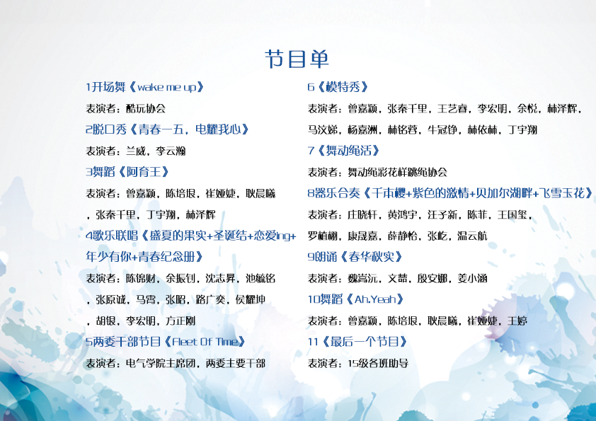 当夜晚会里,电气学子们以梦想为名,以灯光为证,以各式各样的精彩表演给下新生带来一场视听的饕餮大宴。晚会以酷炫的街舞拉开了帷幕,使得晚会一开场便气氛高涨,台下欢呼声掌声不断。紧接着便是艺术团带来的舞蹈《阿育王》,典雅的旋律、曼妙的舞姿还有飘逸的舞步都令全场沉迷。之后的歌乐联唱唱响了电气学子的激情,给观众带来耳朵与眼睛的双重福利。而模特秀表演更令观众看到了时尚青春的电气学子的别样风范,将场上气氛推向了高潮。紧随其后或激昂或低沉的器乐合奏,乐声始终美妙醉人。《春华秋实》诗朗诵给大家展示了福大学子对福大的深深爱意,将场上气氛推向高潮。除此同学们还欣赏到了《舞动绳活》,《Ah,yeah》以及源自生活的舞台剧等等别致的节目。期间还穿插着大二和大三学霸同学的心得讲诉,给予新生启迪。最后,晚会在2015级助导的真情歌声与对新生的祝福和款款告白中缓缓落幕。