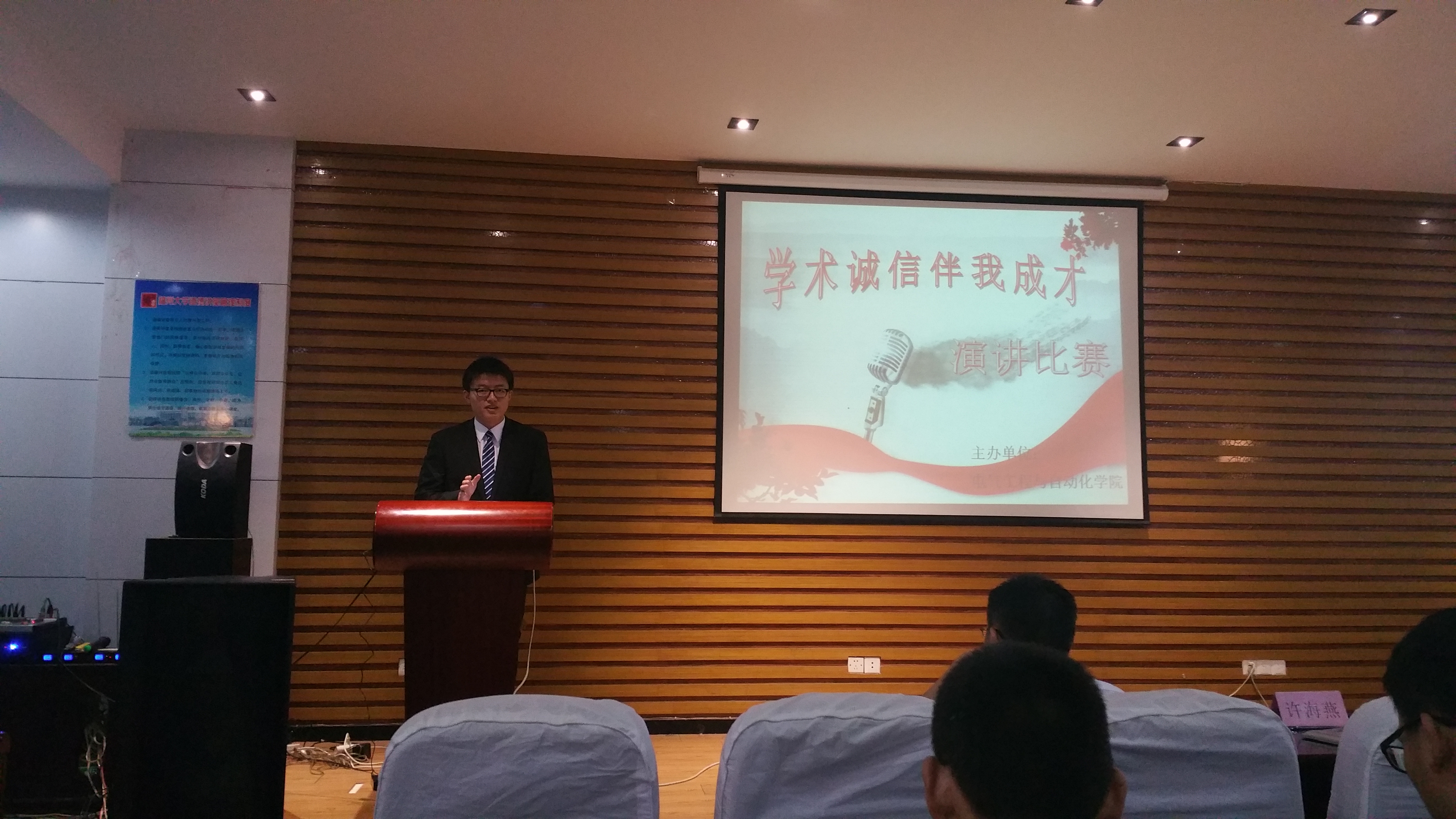 活动一开始,由主持人葛钊同学致开幕词,并介绍到场评委嘉宾。然后,九位参赛选手按照抽签顺序依次登场。参赛同学围绕主题,结合古今中外的具体事例和自己的切身体会,阐述了自己对于学术诚信的看法。 活动中,刘有升老师和张志雄老师对本次演讲比赛进行了点评,在肯定选手们的精彩发挥的同时,指出了选手们在比赛中存在的主要不足,并鼓励同学们总结经验,更进一步。最后,经过分数统计,崔本丽同学获得了一等奖,林子良和邓冰同学获得了二等奖,康亚可,张琦和吴科同学获得了三等奖。与此同时,崔本丽、林子良和邓冰同学还将代表学院参加学校的选拔赛。