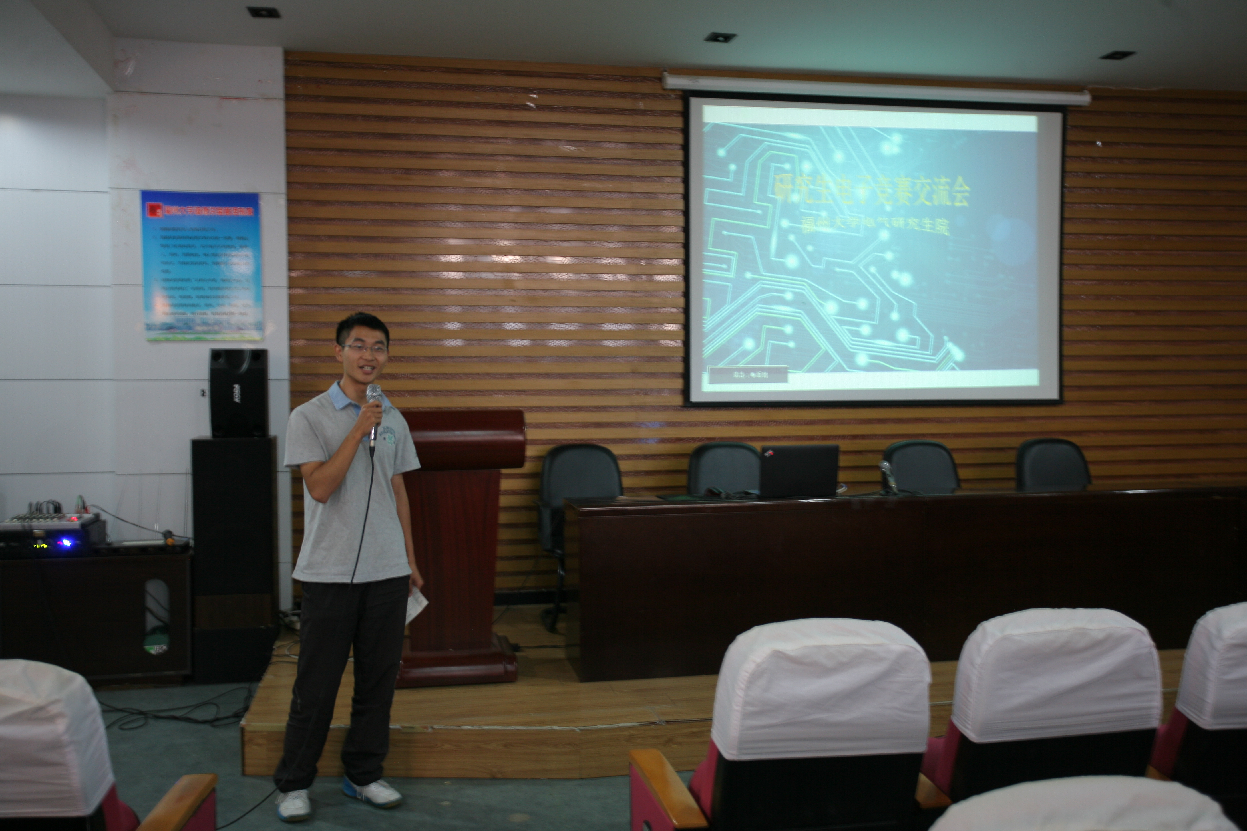 新楚楼北230多功能厅举行,交流会的主持人是电气研会学术部部长柳百毅同学。曾经参加过研究生电子设计竞赛,并且获得了很好成绩的学长分别上台交流自己的参赛经历,并对新生提出的疑问进行了解答。交流会之后,研究生招生办王秦老师指导新生学习研究生手册,并就相关问题进行答疑。