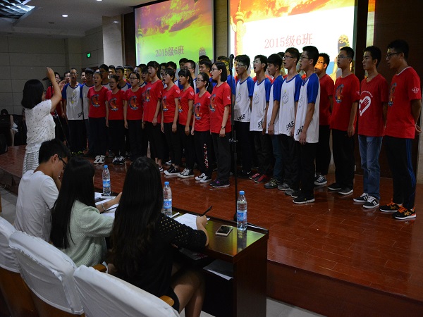比赛在大家的一片掌声和满满期待中拉开了帷幕。本次合唱比赛以班级为单位,参赛者为九个班级的全体15级新生。参赛曲目为必唱的《光荣吧,中国共青团》以及一首自选抗战歌曲。最先登场的六班身着如火般的班服,一开场就把全场的激情引燃,紧随其后的各班级也毫不落下风,或如一班加入朗诵元素、或像八班独唱带动大合唱,各参赛队伍用不同的风格将熟悉的旋律重新诠释,为在场观众呈现了一场精彩纷呈的视听盛宴,高亢的合唱声仿佛再次将我们带到那个充满爱国热情的年代。而无论是契合的歌声,还是默契的眼神交会,无处不体现了各班新生间在数天内就融入大集体建立的浓浓情谊。