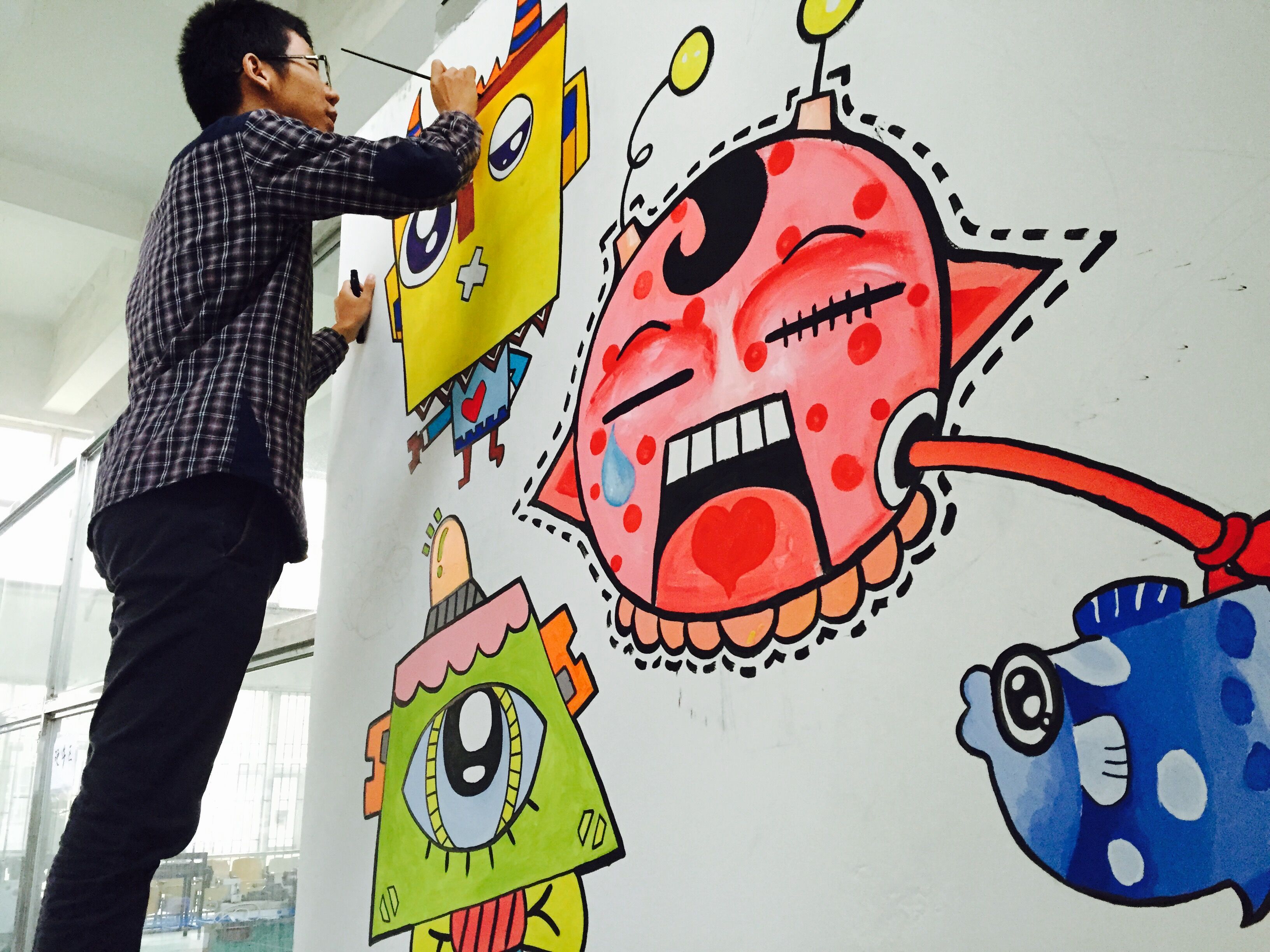 宣传部的成员们一有时间就待在实验室进行彩绘工作,他们在实验室里一边挥舞着手中的画笔,一边听着智能车和机器人运行的声音,从一开始的一片空白到墙体设计到初见轮廓再到最后的上色,这一系列的过程无不融入了麻豆社