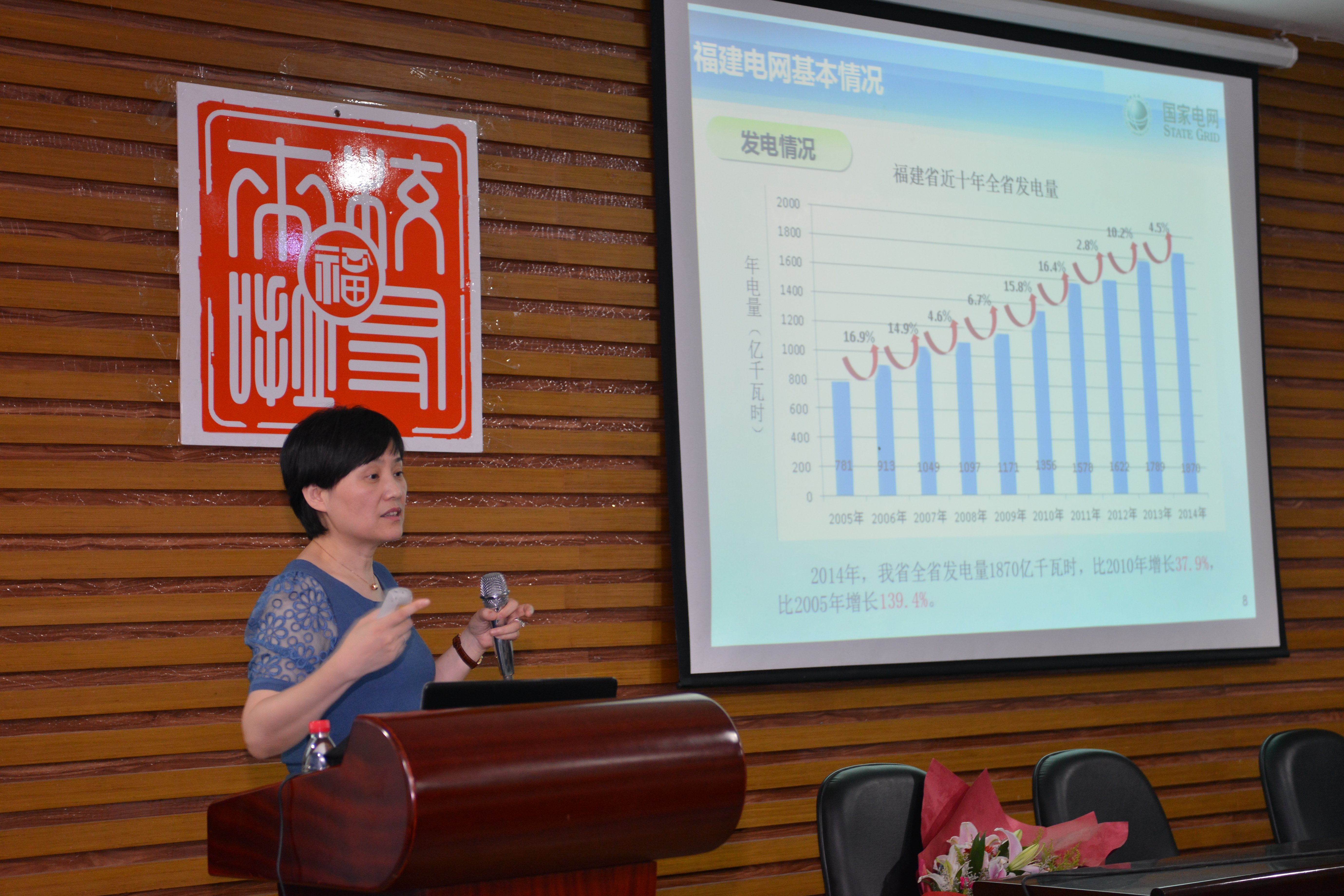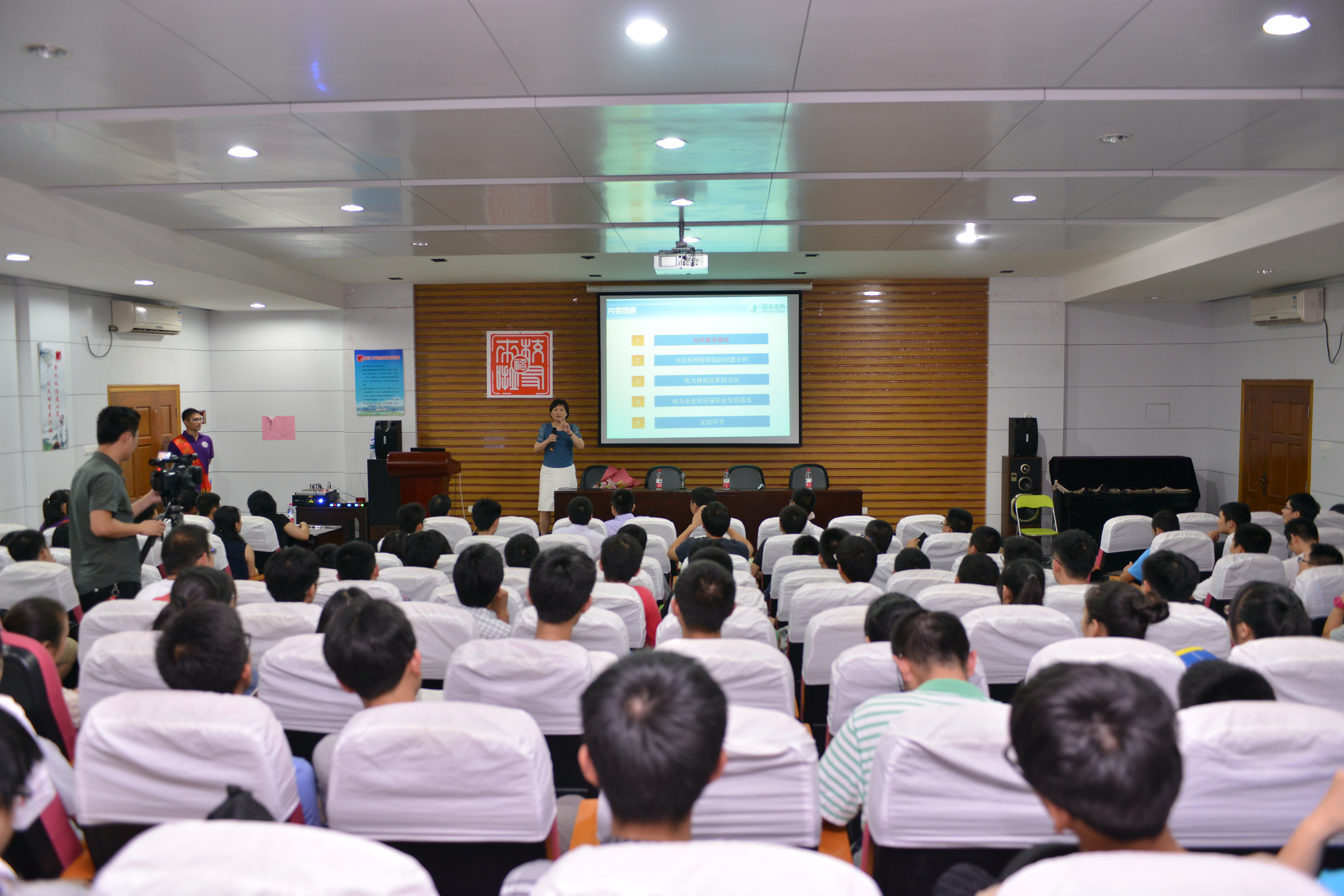 黄文英女士就电网基本情况、今后电网将面临的问题分析、电力体制改革的方向以及电力企业对应届毕业生的需求四方面展开深入的交流。对于现今的电网情况,黄女士站在一个较高的视角分析了近几年福建省发电量增量、清洁能源发电增加比重以及福建省电力网络构架布局,直观地为电力学子介绍了现今福建电网的基本发展概况。紧接着,黄女士对今后电网将面临的几大问题一一进行了深入的描述与分析。她指出,随着国民经济不断发展,经济建设对电网的要求也日益提高。特高压电网快速发展、能源革命不断推进、市场化改革不断深入、智能电网的提出与实行以及电力系统内外部形势变化等大发展所带来的一系列诸如电网过于紧密的连带影响、能源巨大变革、市场开放与管理以及交直流输电综合协调都将成为今后无法回避的问题。