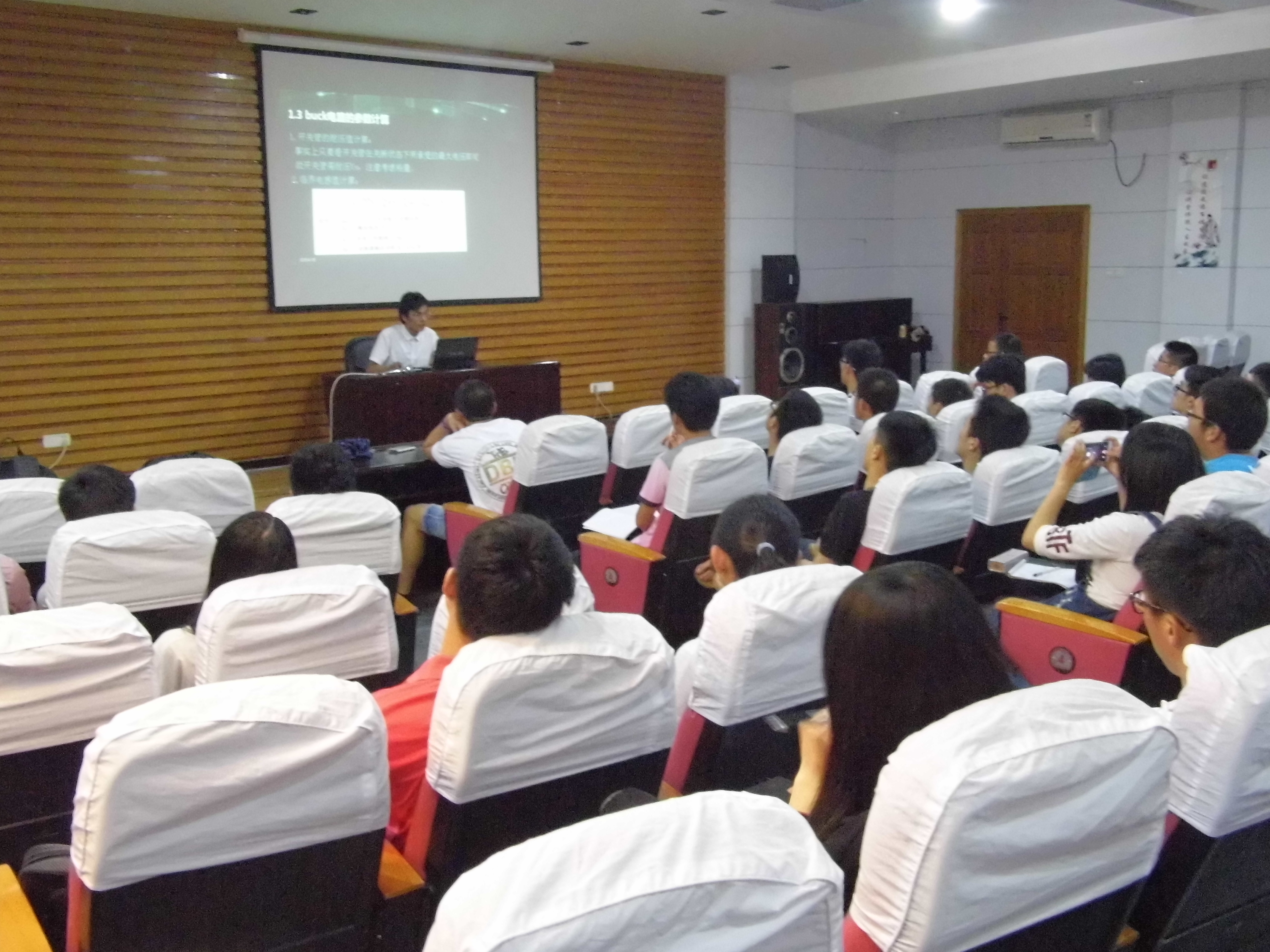 本次培训听讲观众主要为电子设计协会会员以及准备参加国赛电源类的学生,因此庄胜斌会长首先对国赛的基本情况,对参赛者的要求以及需要掌握的相关知识做了个大体介绍,随后培训转入正题。鉴于此次培训关涉知识点较多且难,学员对该内容陌生而难以理解,所以庄会长由简入繁,先用幽默风趣的话语提出并解释了电力电子技术的定义,由此引出了本节的重头戏DC-DC电路的概念。之后,庄会长引经据典,对模电、数电的相关知识信手拈来、巧妙论述,从容而翔实地为听众分析讲评了BUCK电路、BOOST电路、正激电路以及反激电路等几类重要的DC-DC电路,令听众通过已掌握的熟悉知识来探索新接触领域,思路更加开阔明了,对DC-DC电路有了大体了解,研究志趣也更加浓烈。最后,本次培训圆满落幕。