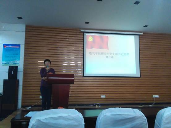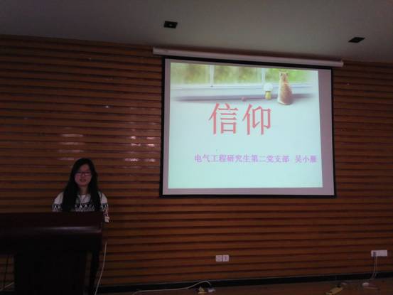 此次活动由电机与电器研究生党支部书记许共龙和电气工程研究生第二党支部副书记吴小雁以微党课的形式与党员进行学习交流。参加此次党课的有许海燕辅导员以及电机与电器研究生党支部和电气工程研究生第二党支部的全体党员。首先,由许共龙引用当前热点时事,陈述“四风”现象,对形式主义、官僚主义、享乐主义、奢靡之风逐一进行介绍,同时结合党员身边的一些案例,如“光盘行动”等,号召大家从身边做起,以身作则,杜绝“四风”。接着,吴小雁结合当前大学生政治信仰的“真空化”、“利益化”“物质化”的现状,讲述中国梦如何引领大学生政治信仰教育,通过观看大型历史纪录片《信仰》,激励与会党员将自己的理想信念与“中国梦”结合起来,为实现梦想而努力奋斗,坚定共产主义信仰。最后,许老师对本次党课进行了总结,对党员提出杜绝“四风”,坚定信仰的要求,并希望党员将理论学习践行到实践中,充分发挥党员的先锋模范带头作用。