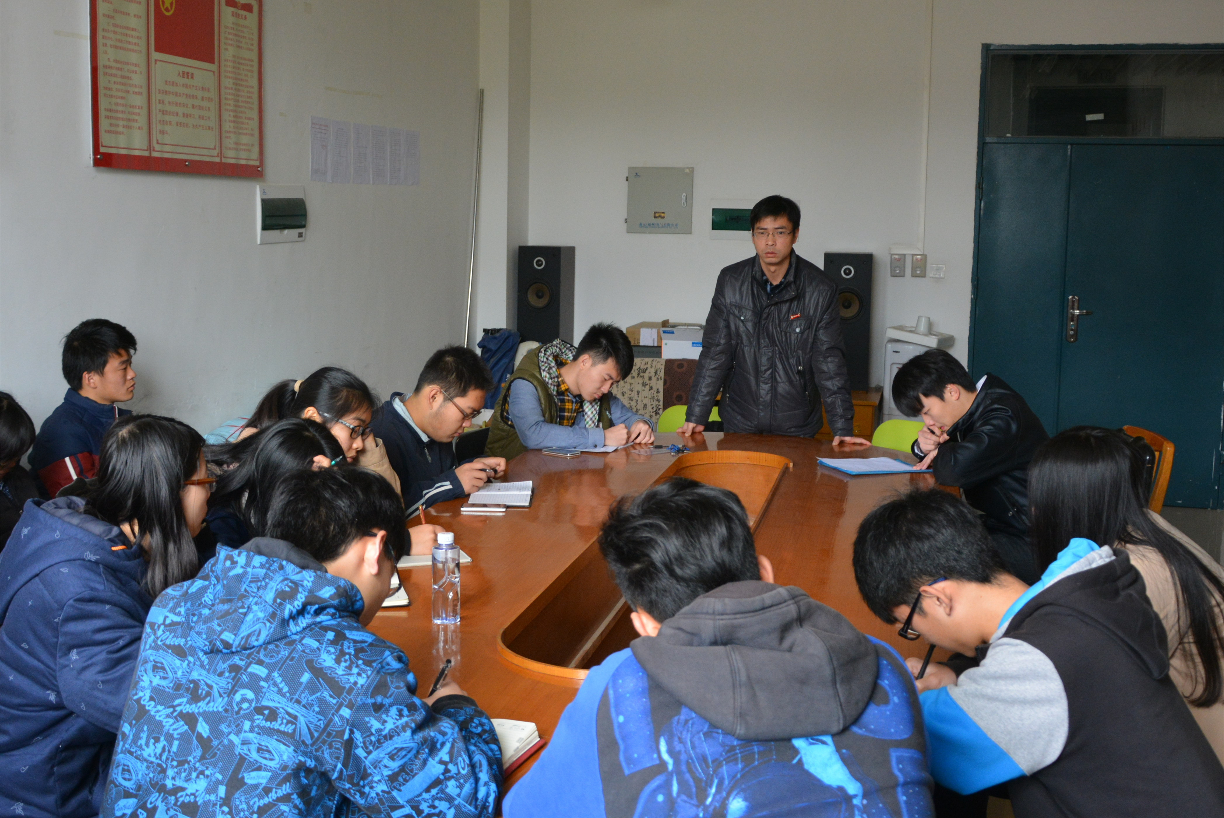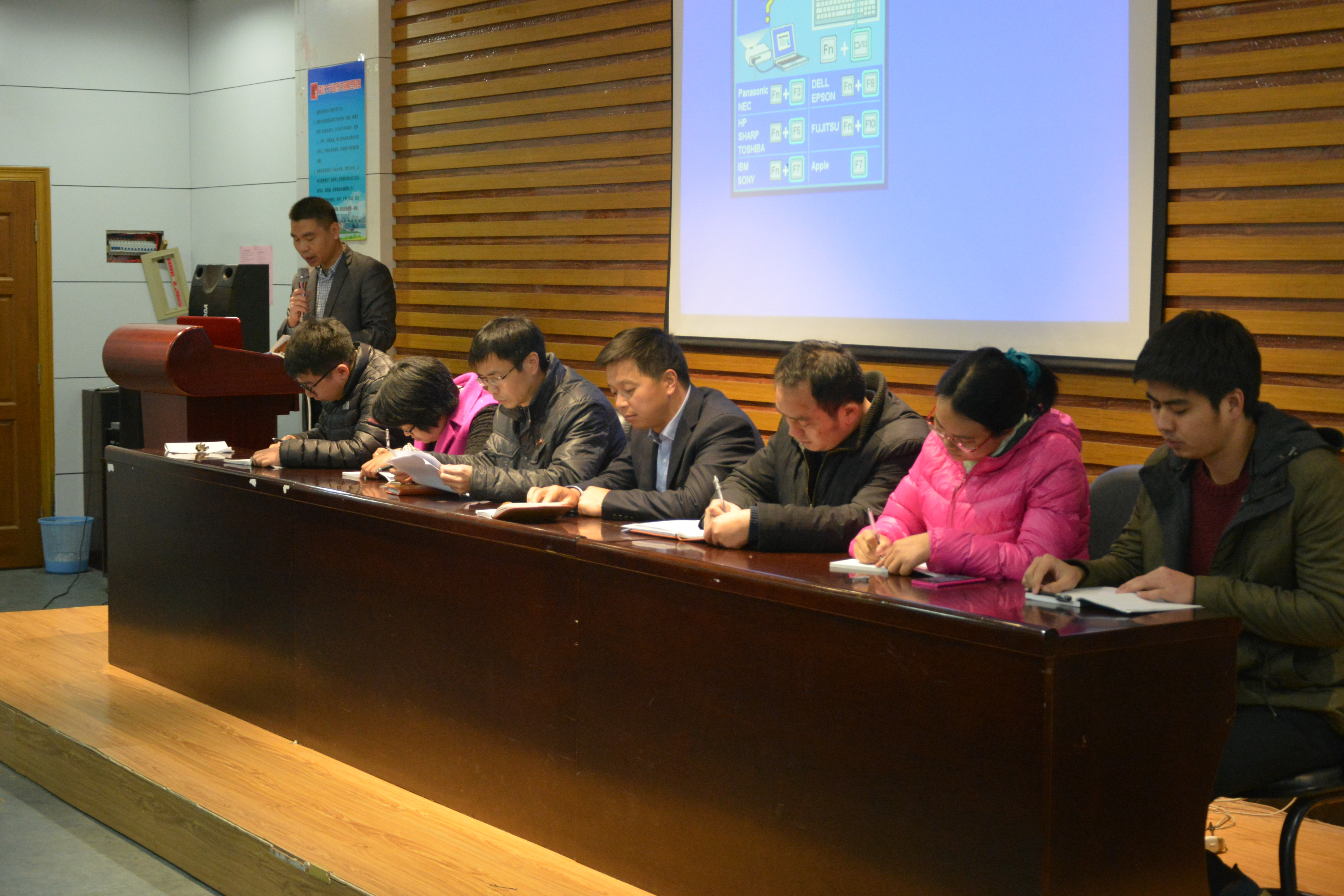 12级辅导员陈荟芳,13级辅导员段小华、傅志强,14级辅导员尹万东,兼职辅导员茹晓东,以及学生干部等共百余人,其中,沈庆斌老师主持了此次大会。