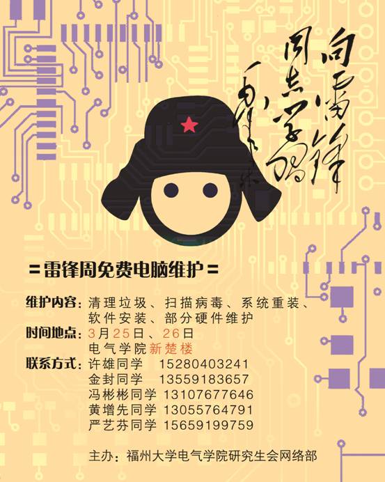此次公益电脑维护活动,旨在贯彻“两会”精神,并进一步弘扬雷锋精神,以实际行动为全院师生排忧解难,受到了师生们由衷的欢迎和普遍赞誉。这次活动既提高了干部动手能力,进一步发扬了雷锋的无私奉献精神,又让同学们对雷锋精神有了更为深刻的了解,并引导同学们自发地学习雷锋,真正做到“为人民服务”,成为一个有爱心、责任心、感恩心的福大电气研究生。