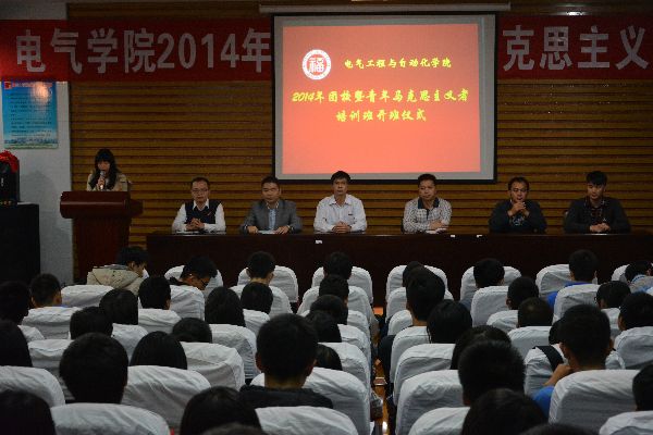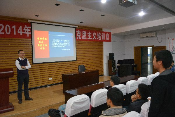 2014年团校暨青年马克思主义者培训班在新楚楼北230隆重开幕了。院党委副书记黄国辉老师、团委书记张志雄老师、副书记沈庆斌老师、2014级辅导员尹万东老师以及校研究生会副主席郑伟彬同学、院团委副书记刘荣灿同学参加了开班仪式。