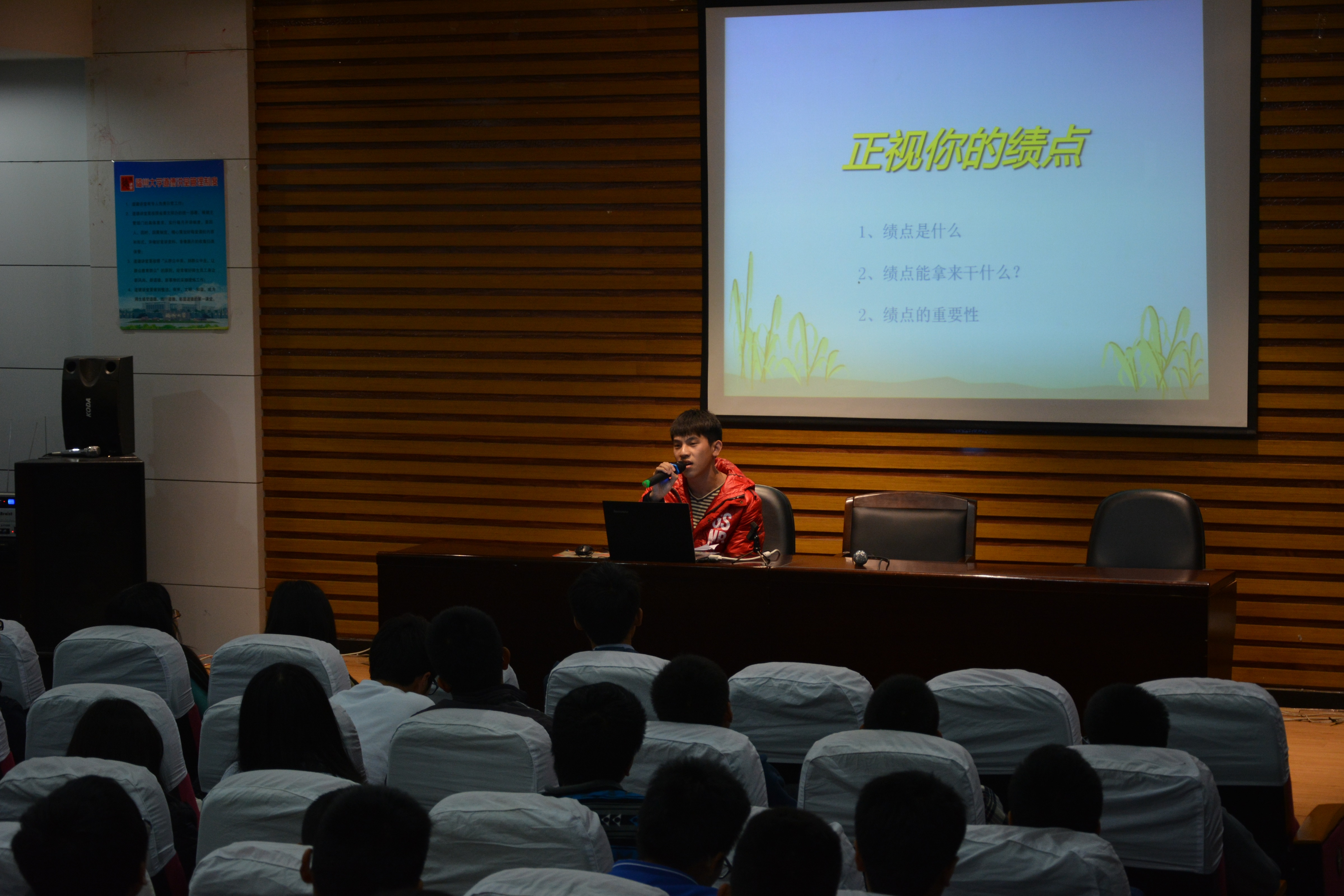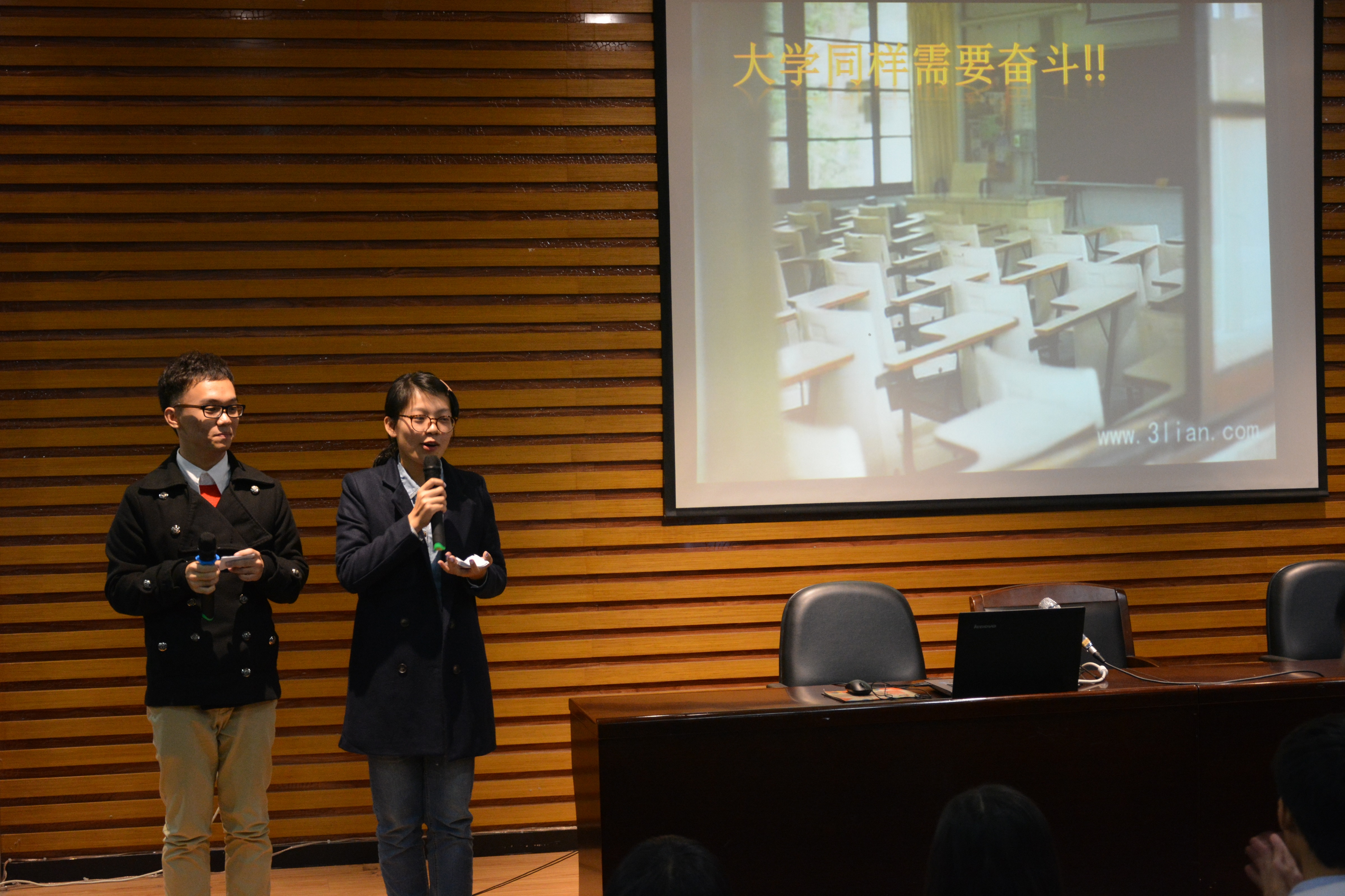 学习部与楼委会承办。学生会主席刘伟、学生会副主席孙羽宁、科技部部长谢阳腾、青年志愿者协会副会长陈伟敏以及13级总分第一的孔顺飞同学上台与14级新生交流了自己的学习与工作的经验。
