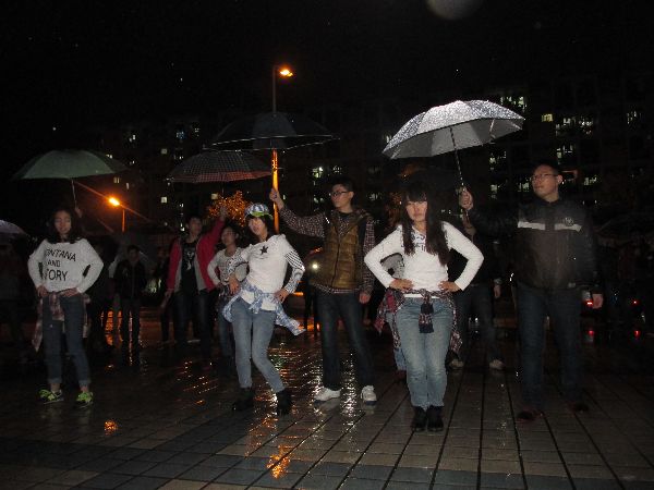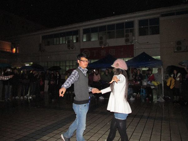 细雨蒙着夜色,舞会在来自艺术团的五位女生的热舞中开场。作为嘉宾的邓潇老师带着4个男生上前为女生撑伞,伴着动感的音乐,女生们精湛的舞技点燃了全场的激情。紧接着,三对男女舞者走出,旋转在舞台中心,酣畅淋漓地演绎着灵动与默契。在场的同学们身体内的舞蹈细胞被唤醒,跃跃欲试。热舞的女生们退场后,主持人向在场观众分发精致的假面,大家纷纷上前领取。领到面具的同学们站在舞台中央,由飞扬与酷玩的爱好者们进行现场舞蹈教学。从“十六步恰恰舞”到“浪漫华尔兹”,同学们在舞者的带领下渐渐地进入状态,学习的队伍吸引了越来越多的人,优雅的舞步,曼妙的音乐,醉了雨夜,忘了时间。