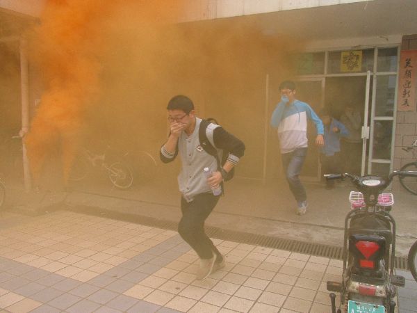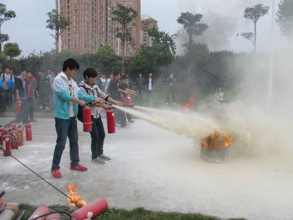 随着一声刺耳的报警声响起,2号楼突然“起火”,四周马上被黄色的浓烟笼罩。听到报警声,同学们在第一时间就冲出宿舍,纷纷奔向楼梯,此时,情势虽急,但是秩序井然,脚步虽快,却不推搡拥挤,傅老师一直在楼前高声呼喊,指挥着同学们快速撤离火场。不一会儿,一群人捂着鼻子穿过厚厚的烟幕,冲出了大楼。 “劫后余生”的同学们到了青春广场显然还有些激动,热烈地交流着各自的感受。保卫部的江老师对大家的表现做了简短的点评,随后,大家整队前往新楚楼背后的空地,在那里学习了灭火器的使用。值得一提的是,每个同学都得到了使用灭火器的机会。面对熊熊大火的时候,大家激动之余还是略显紧张,其中就有位女同学对着火焰喷了许久,没能把火扑灭,最后两个男生挺身而出,才成功熄灭了火焰,现场颇为热闹。