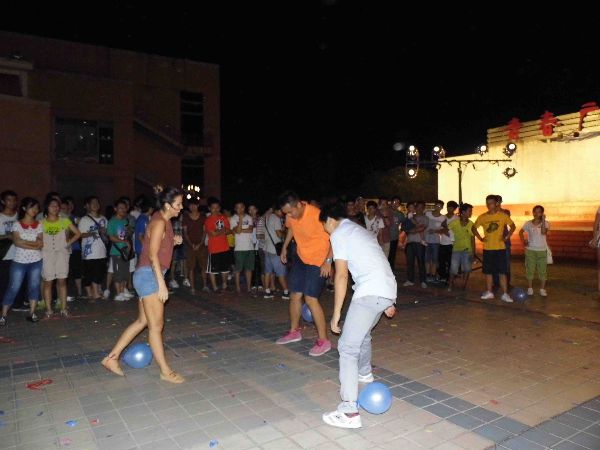 的各个学院,现场热闹非凡。笑声、喊声、掌声,各种欢快的声音弥漫在青春广场的上空。其中最火爆的当数舞台上K歌的环节,不仅吸引来了众多好声音,还有一些参赛者借此机会祝愿同学生日快乐、中秋快乐,温馨而感人。参赛者大多是13级的新生,在这次的游园会中也是玩得最开心的群体,这也是他们来到福大的第一个中秋。