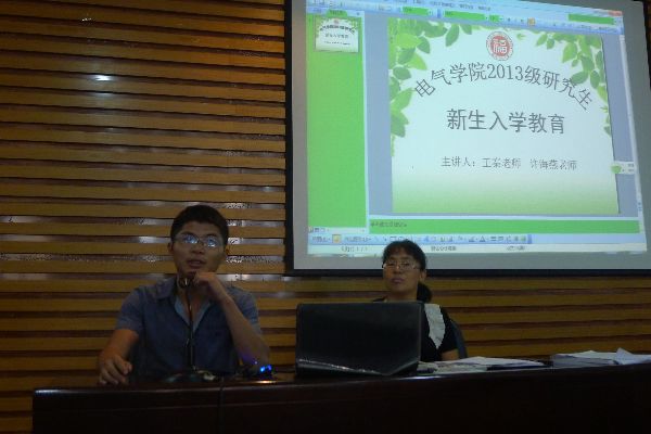 为了让研究生新同学尽快适应新生活,熟悉校园环境及学生管理制度,2013年9月6号上午,于福大电气多功能厅召开了新生入学教育大会。辅导员许海燕老师和王秦老师主讲并主持本次大会,参加会议的还有新一届研会干部和全体研一新生。