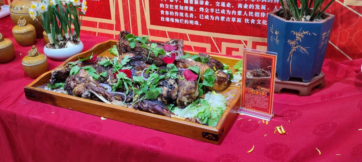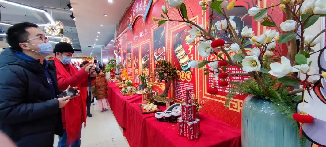 康礼炜:进入餐厅先发了一条红色的围巾,餐厅也挂上了灯笼、海报等等喜庆的装饰,中间的展台展示年夜饭将会呈上的几大菜式,两边还有自助的水果、小菜。带着红围巾的人群、明亮温馨的灯光、喜庆的装饰让人忘了在异乡的孤独。在年夜饭开始前的短暂时间里,大家纷纷拿起手机记录在校过年不一样的温情时光。