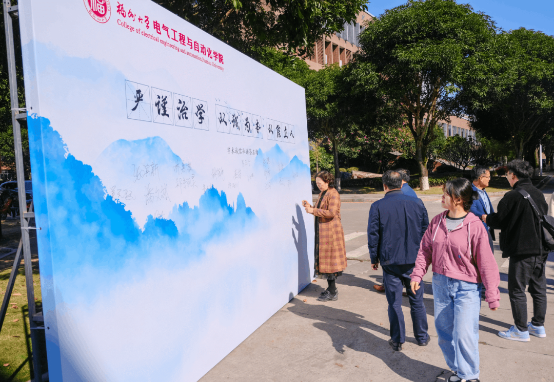 院长许志红教授、党委副书记钟钛申、团委书记李金土、研究生辅导员许海燕、14位2023年研究生国家奖学金获得者等师生在学术诚信墙上签名倡议。学术签名墙的签名表达了他们遵守学术诚信的决心,也是他们向广大师生发出的有力倡议。签名墙不仅是一面宣扬学术诚信的旗帜,更是一个充满榜样力量的宣誓,激励着电气学子在求学之路上坚守诚信、远离造假。