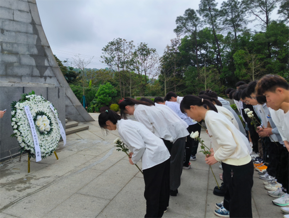 烈士埋骨青山,献花告慰忠魂。祭英烈仪式开始之时,学生代表们向丰碑献上花圈,赖先民老师上前整理,同学们静默一分钟后,向长眠于此的烈士们行三鞠躬礼默哀,以表达对他们的崇高敬意和无尽哀思。