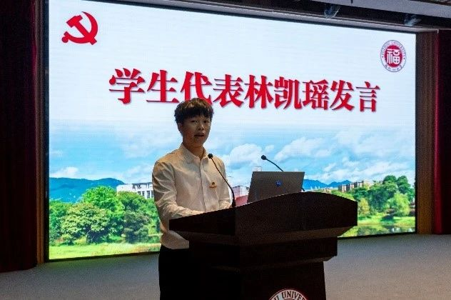 然后,由学生代表林凯瑶同学发言。首先林凯瑶同学代表所有发展对象对各级党组织的关怀与支持表示衷心的感谢。林凯瑶同学提到在当今世界正处于百年未有之大变局,作为未来的新时代党员,我们要勇立时代潮头,走在时代前列,为党和人民贡献青春力量。林凯瑶同学希望同学们向优秀党员看齐,用党员的标准要求自己,坚定党的精神信念,内化于心、外化于行,传承先辈的奋斗精神,推动中国这艘东方巨轮在历史洪流中再创辉煌。
