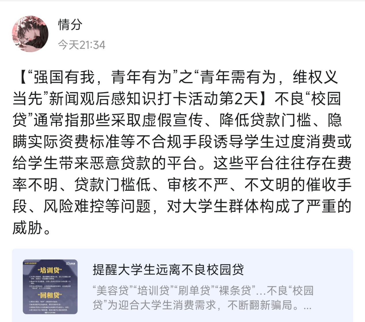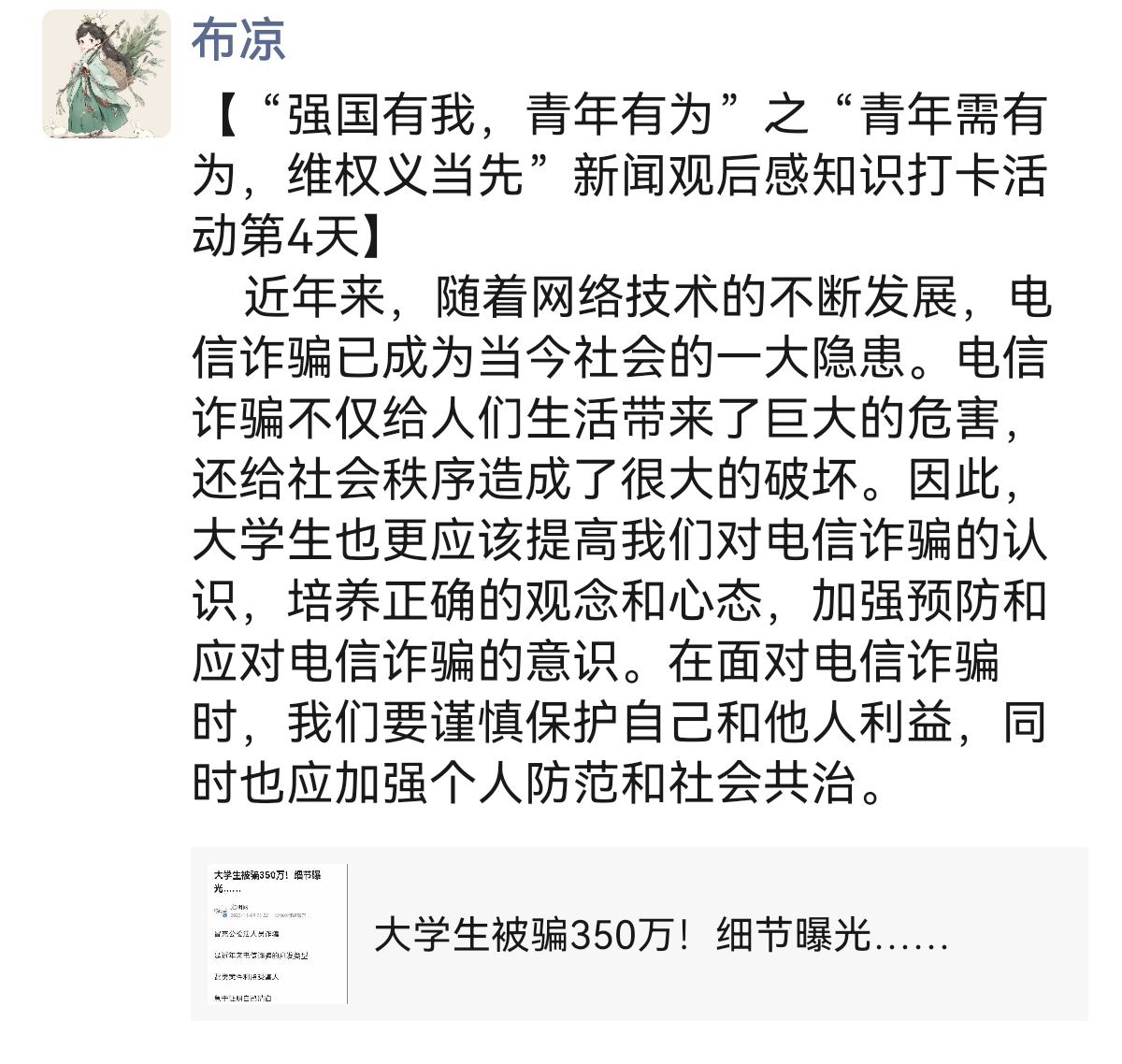 决定举办“青年需有为,维权义当先”新闻观后感知识打卡活动,采用阅览不同类型的诈骗新闻为同学们普及有关诈骗的类型和防范方法和手段知识。