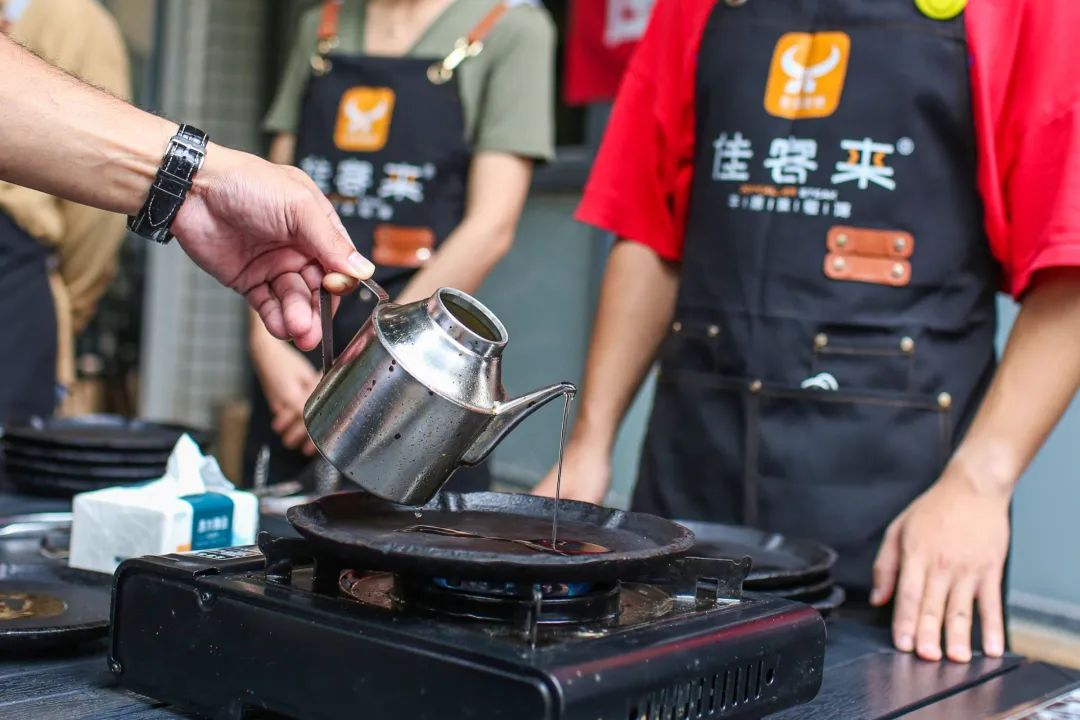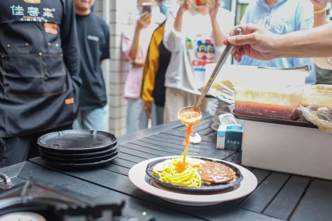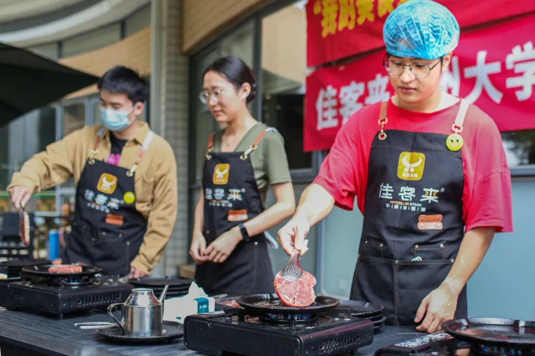 同时,师傅通过现场制作牛排,给同学们带来一场视觉盛宴和美食品尝。师傅先将平底锅置于火炉上,大火预热,再倒入适量的橄榄油,橄榄油的量以覆盖锅底为宜,当油开始冒烟时,说明油温已经够了。将牛排慢慢地放入锅中,可以听到“滋滋”的声音,等待8-12秒,使得牛肉的汁水被充分保留在内部。