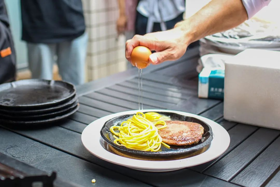 然后,在锅上打上一个鸡蛋,利用余温将其煎熟,并根据自身喜好添加不同份量的意面,以及不同口味的的酱料。