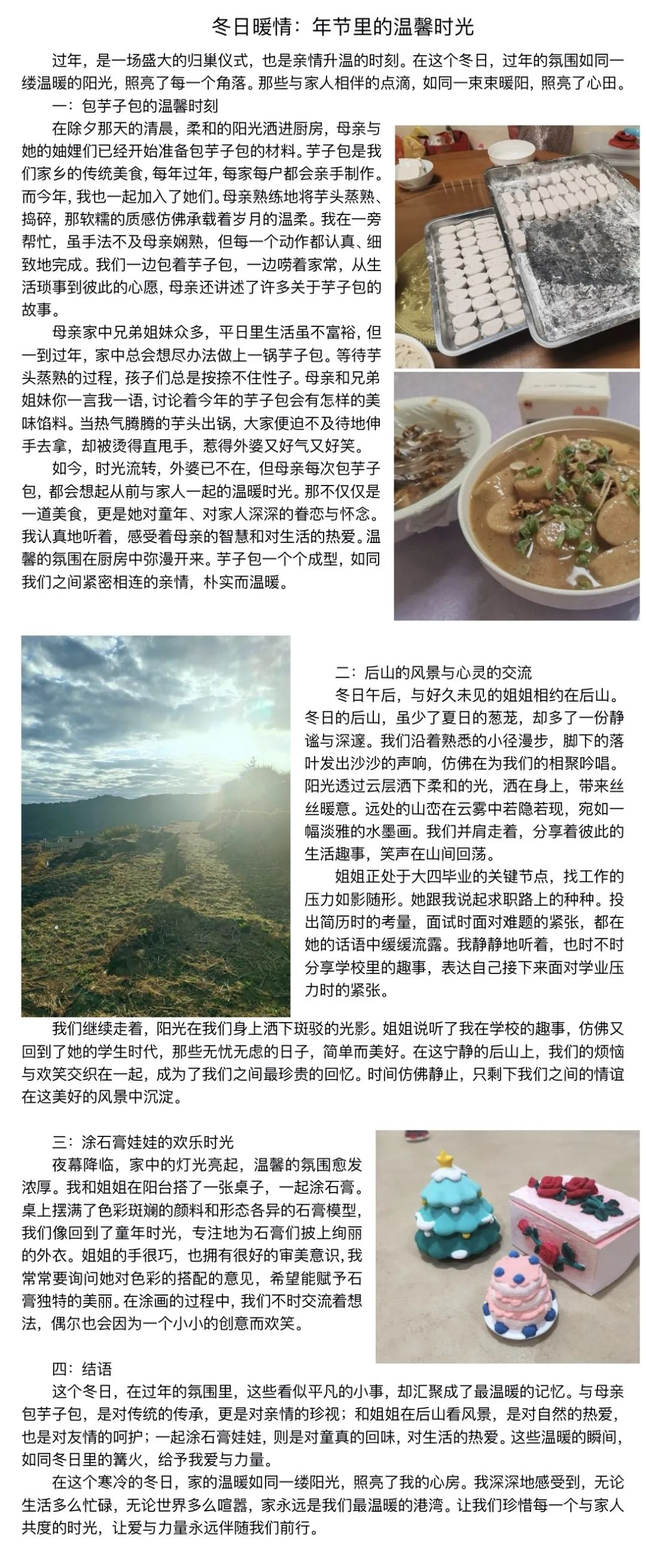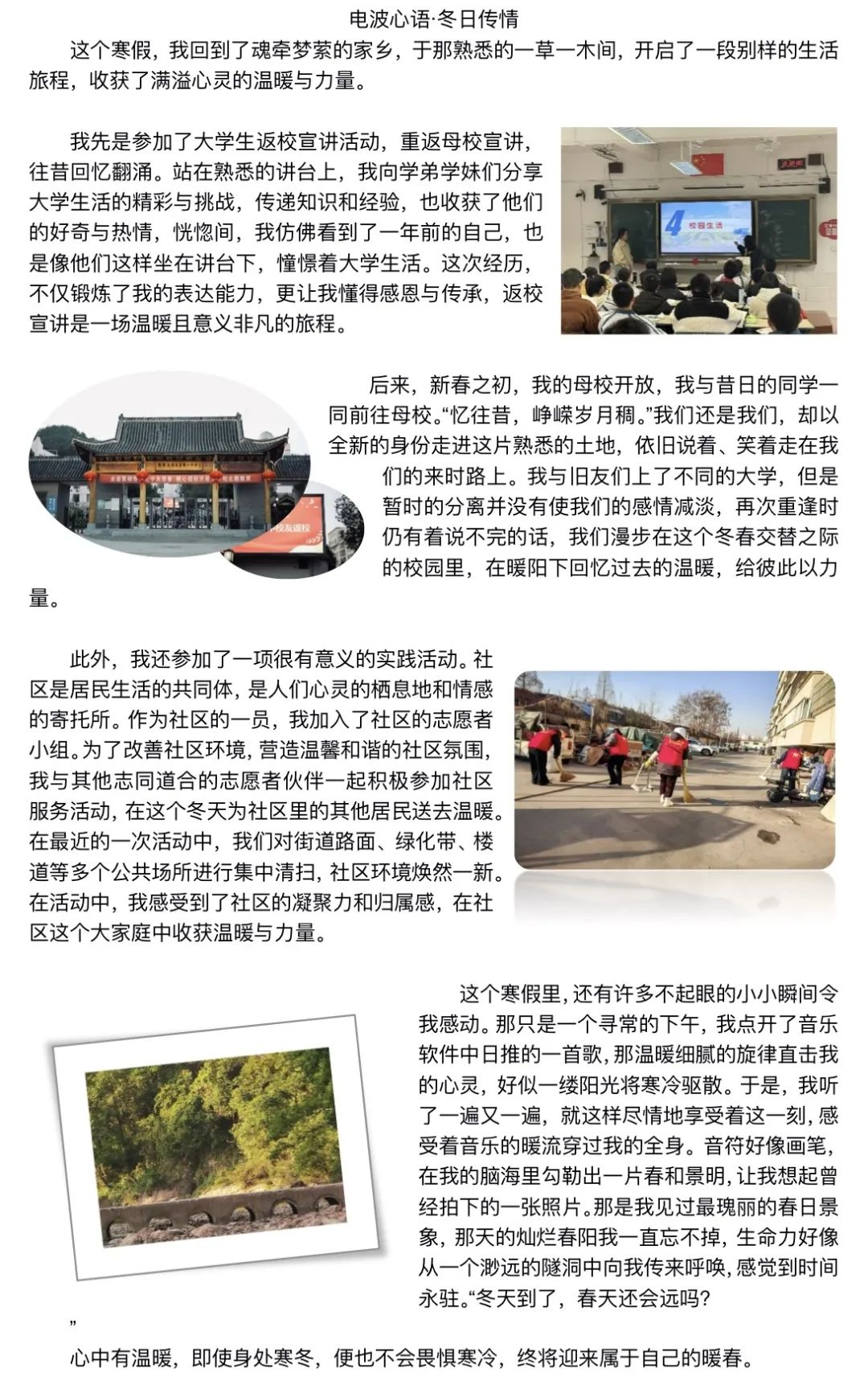 此次"电波心语·冬日传情"活动圆满落幕,共收到许多饱含深情的原创作品。从北国雪乡到南国暖阳,从阖家团聚到独居思考,每一份故事都是情感的共鸣,每一次分享都能凝聚力量。本次活动不仅帮助同学们实现"情感疗愈",更让社会关爱在分享中持续传递。这个冬天,我们不再是一个人在路上,而是与无数温暖的故事同行。感谢所有创作者用镜头与文字编织冬日的童话,也致敬每一位在寒冷中守护温暖的灵魂。此次活动圆满成功,期待未来继续与您共书人间暖意!