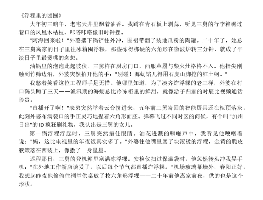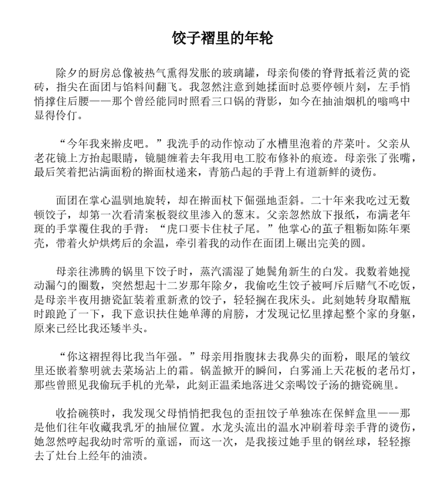 · 掌纹里的时光:母亲布满茧子的手包裹着面团,女儿灵巧的手指捏出十八道褶子
