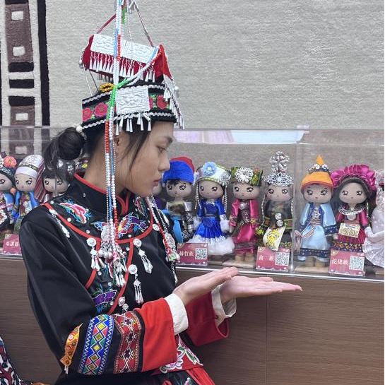 在民族服饰体验区,哈萨克族的星辰马甲、维吾尔族的艾德莱斯绸、蒙古族的苍狼图腾腰带、畲族的凤凰彩带次第铺展。讲解员以服饰为钥,开启文明对话:苗银的月牙纹刻着祖先迁徙的星轨,藏族氆氇的色块是雪山与草甸的和解,哈萨克族太阳纹刺绣暗藏游牧与农耕的默契。当汉服的“交领右衽”遇见维吾尔族艾德莱斯绸的几何律动,当畲族彩带的凤凰与蒙古袍的苍狼共舞,衣襟上的每一道纹路都在诉说——差异是斑斓的起点,交融才是永恒的归途。五十六族针脚各异,却始终缝在同一幅华夏锦缎之上。