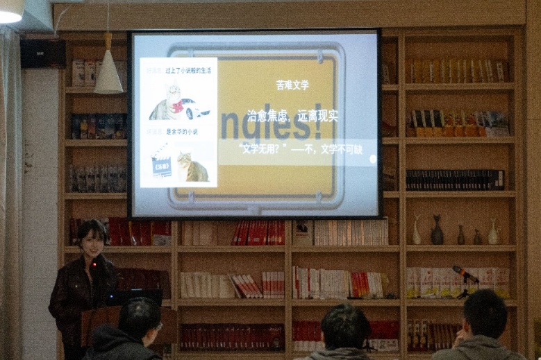随后开展了朗诵与情景演绎环节。书友深情诵读宋凡平的故事,文字的力量借声音直击心灵,主人公宋凡平高大善良的父亲形象清晰浮现,满含悲悯与温情的情绪在空气中蔓延,让同学们悄然动容,真切触摸到苦难中闪耀的人性光辉。 分享会设置的议题“如果李光头没有暴富,兄弟关系是否可能维持?”如同一石入水,激起层层思辨涟漪。同学们就此展开激烈深入的交锋,有人认为财富是关系异化的元凶,有人则坚持命运的悲剧内核早已注定,观点碰撞引发了大家的深度思考。我们进一步直面深刻的灵魂叩问:在安稳的今天,为何还要走进《兄弟》的苦难?经过思想交锋,大家达成共识:余华书写苦难绝非贩卖悲伤,而是一场庄严的“对抗遗忘”,他让我们在笑与泪的复杂体验中,理解父辈走过的峥嵘路,进而更清醒地审视当下的生活。