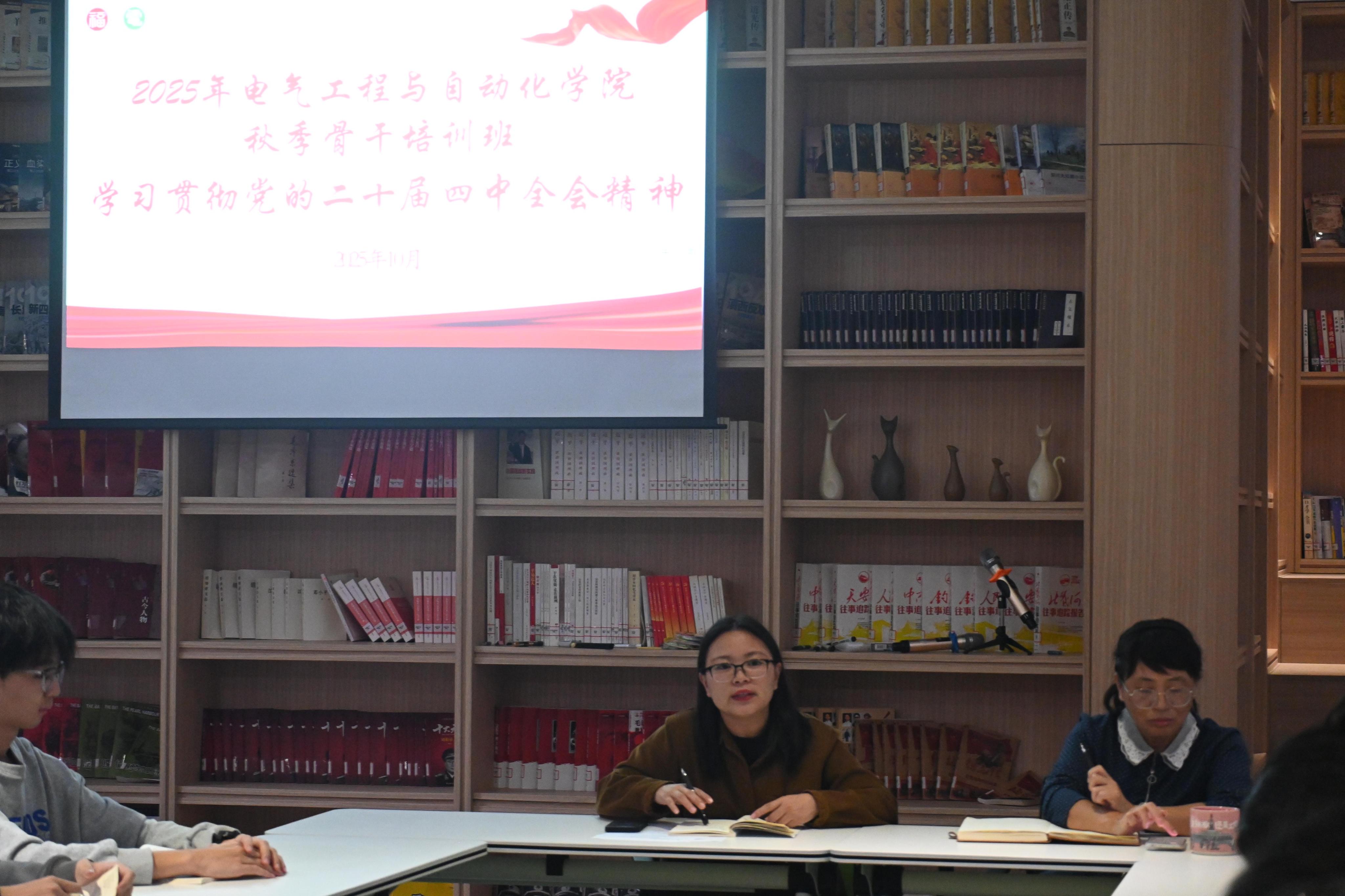 学习交流会上,杜书记首先带领全体学子深入学习二十届四中全会精神,并提出三点明确要求:一是坚持深学筑基,原原本本研读全会公报与《中共中央关于制定国民经济和社会发展第十五个五年规划的建议》原文,深刻领会“科技自立自强”“新型能源体系”等部署的战略内涵,在学思践悟中筑牢思想根基;二是注重细读破题,结合电气学科特色精准把握核心要义,厘清学科发展与“双碳”目标、能源安全等国家战略的内在关联;三是强化执行见效,将学习成果转化为具体行动,把理论认知落实到专业学习与科研实践中,确保全会精神落地生根。